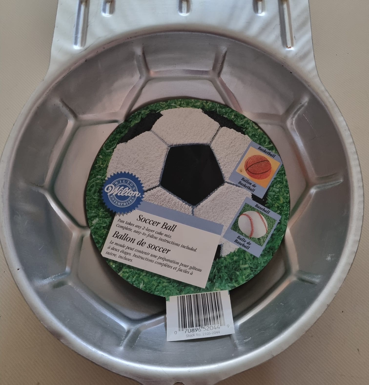 Soccer half ball cake tin pan. This is a pre-loved item with slight scratches. However the pan is still in a perfectly working/ baking condition. Original Wilton cake pan. Bake 2 half’s and join together or bake a half ball and add onto a sheet cake. Measures 22 cm in diameter.