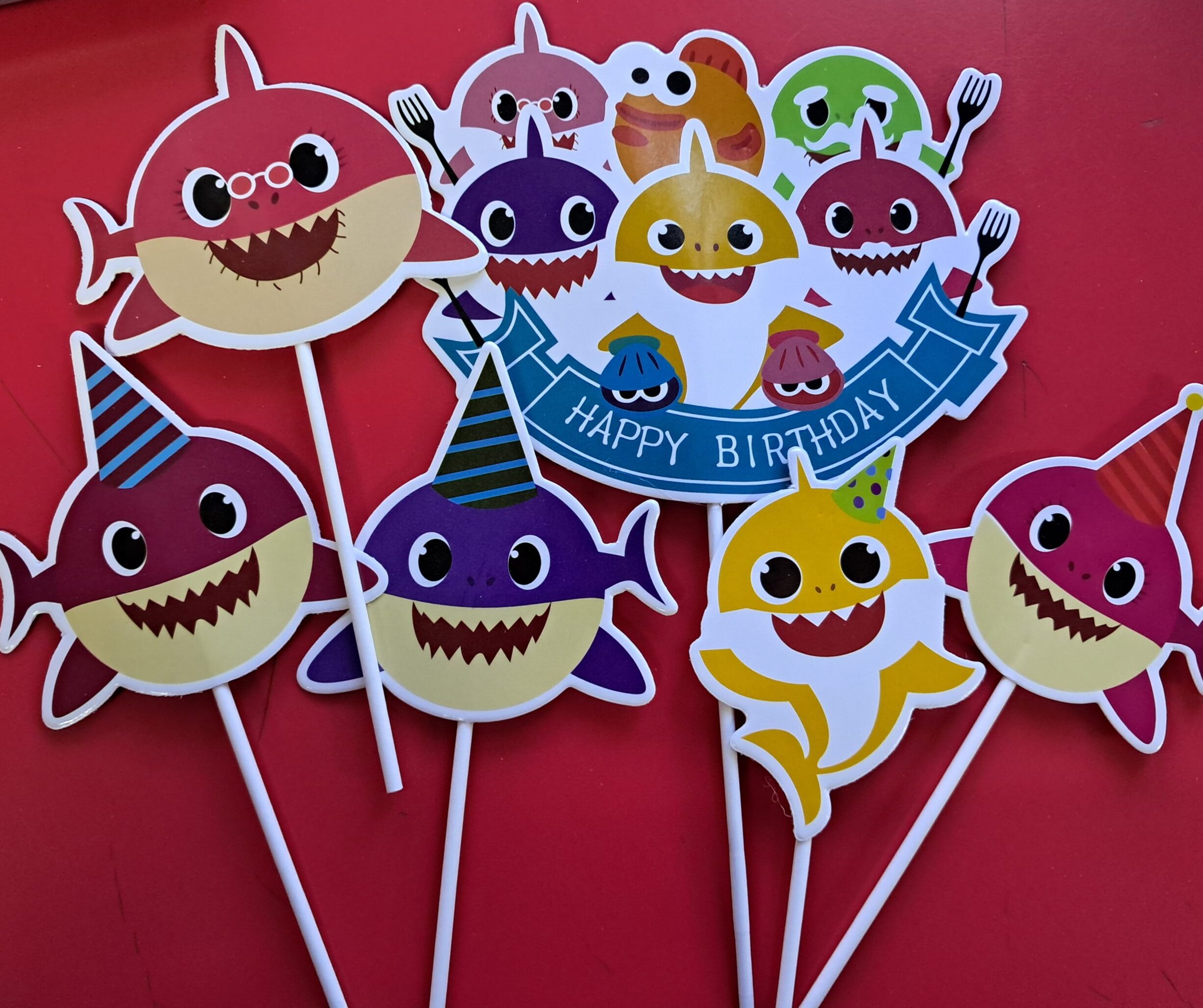 Baby shark cardboard cake topper picks 6’s. Cardstock toppers. Simply stick into a cake or baked goods. Easy way to create a birthday cake without spending a fortune.