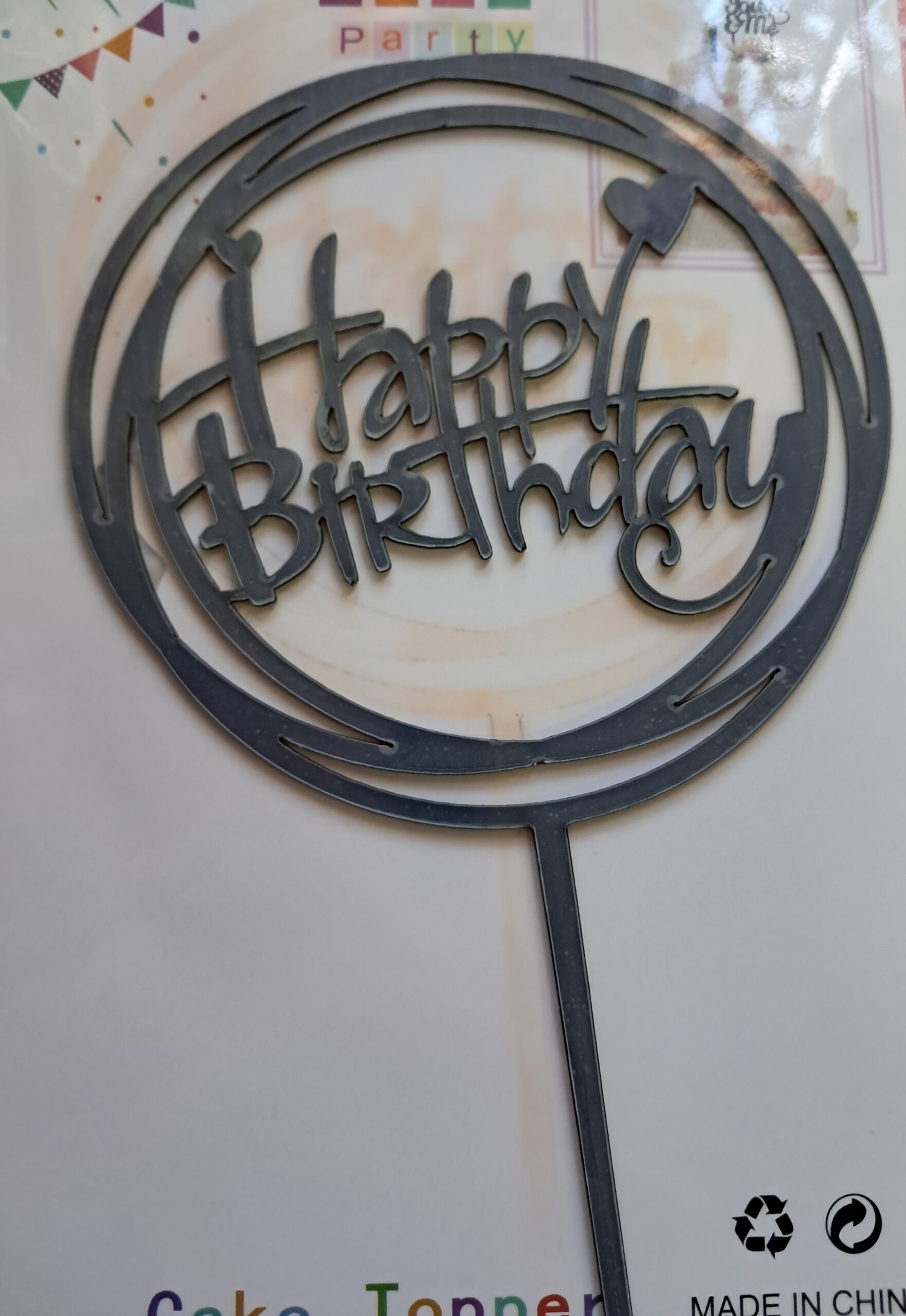 Black happy birthday cake topper round. Stick into a cake, tart or bouquet. Great way to easily add a special touch.