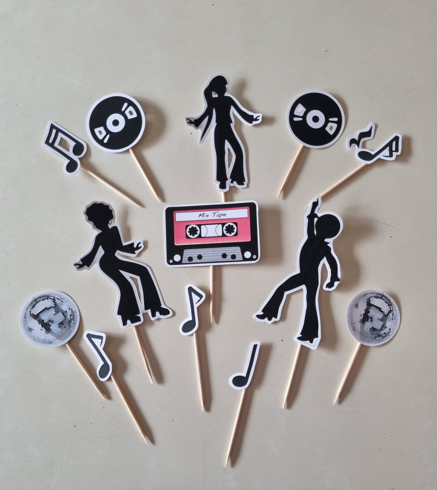 Disco theme cardstock cake topper set. Cardboard toppers in a disco dancing theme. Simply stick into a cake, cup cakes or other treats. Perfect way to highlight your party theme. Cardstock toppers are not edible and for decorative purposes only. Sold as a set.