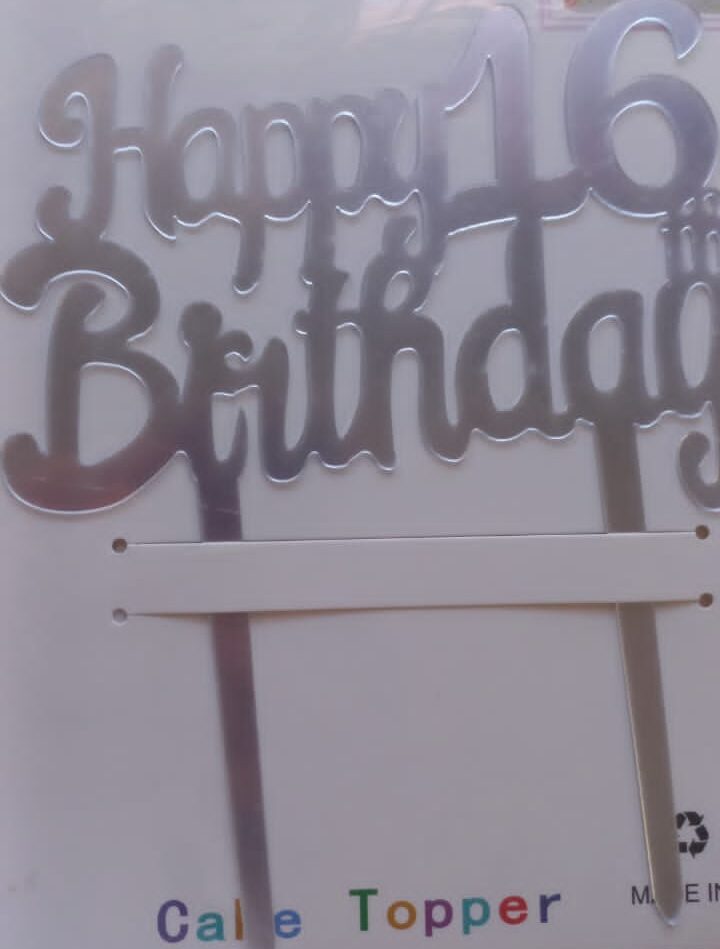Happy 16th birthday cake topper silver. Stick into a cake or tart. Great addition to a 16th birthday party.