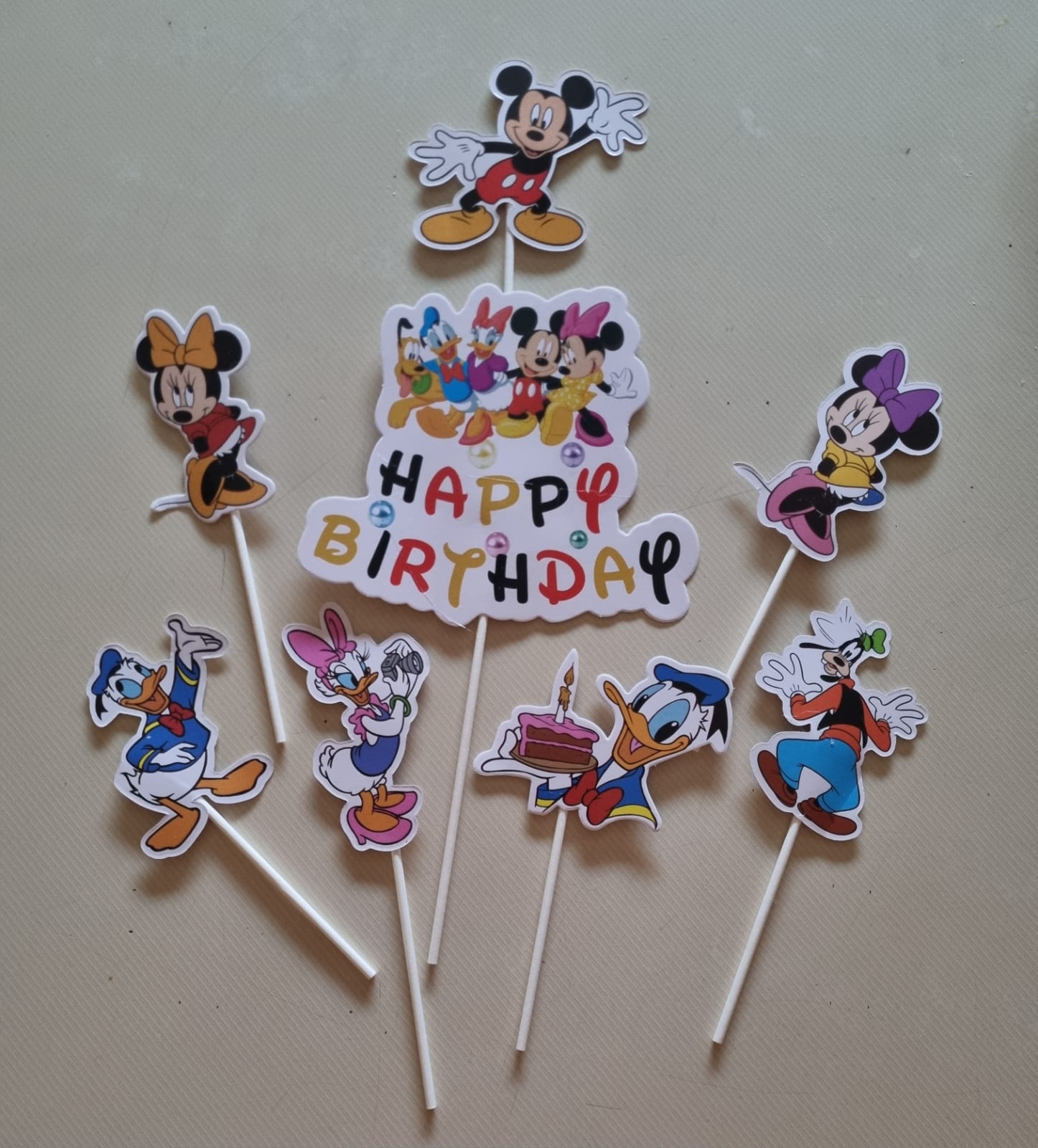 Minnie and mickey cardboard cake topper set. Set consist of Mickey, Minnie and friends. Simply stick into a cake or baked goods. Easy way to quickly jazz up a normal store bought cake. 8 Piece set.