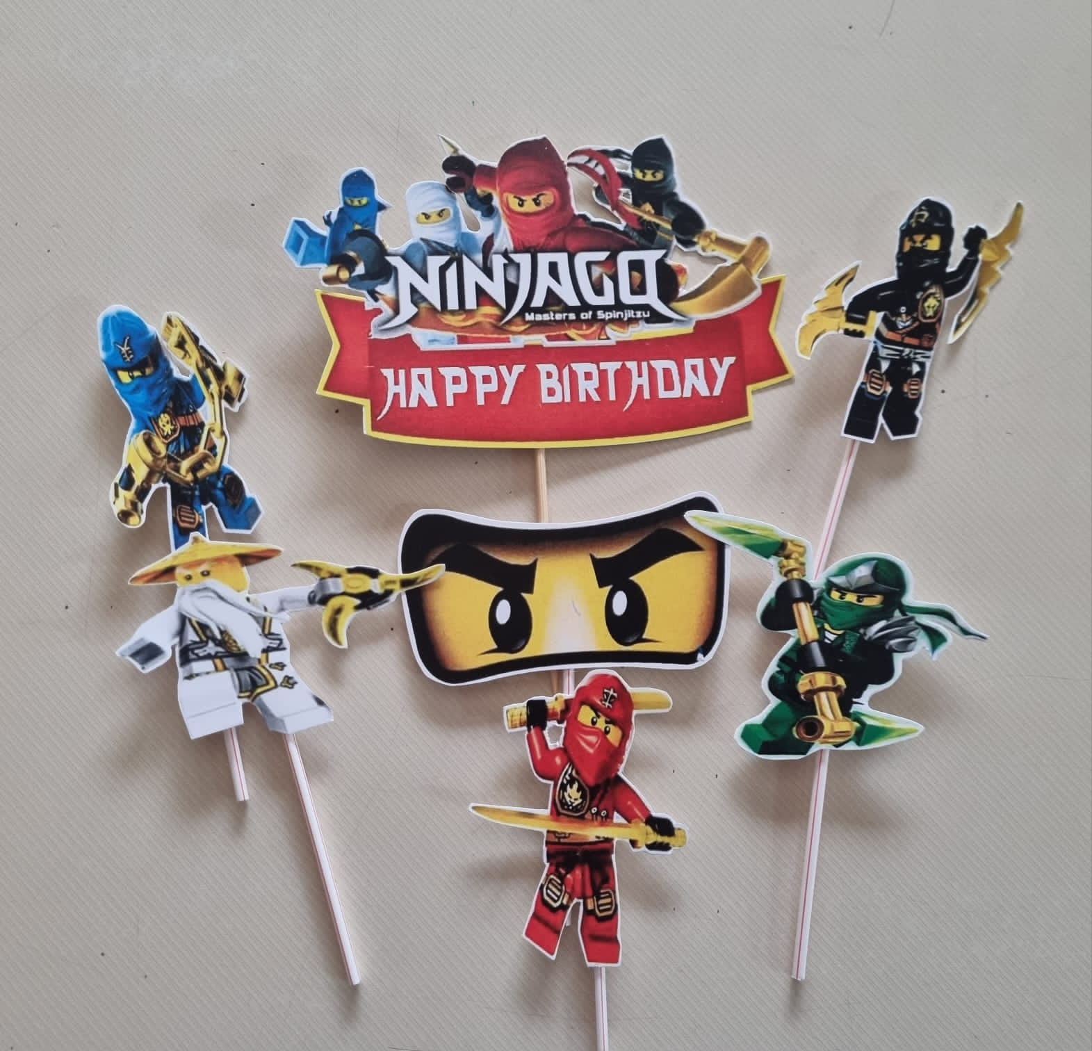 Ninja block cardstock cake topper set. Set consist of 7 pieces. Not edible. Simply stick into a cake, cup cakes or others treats. Great with a Ninja theme party.