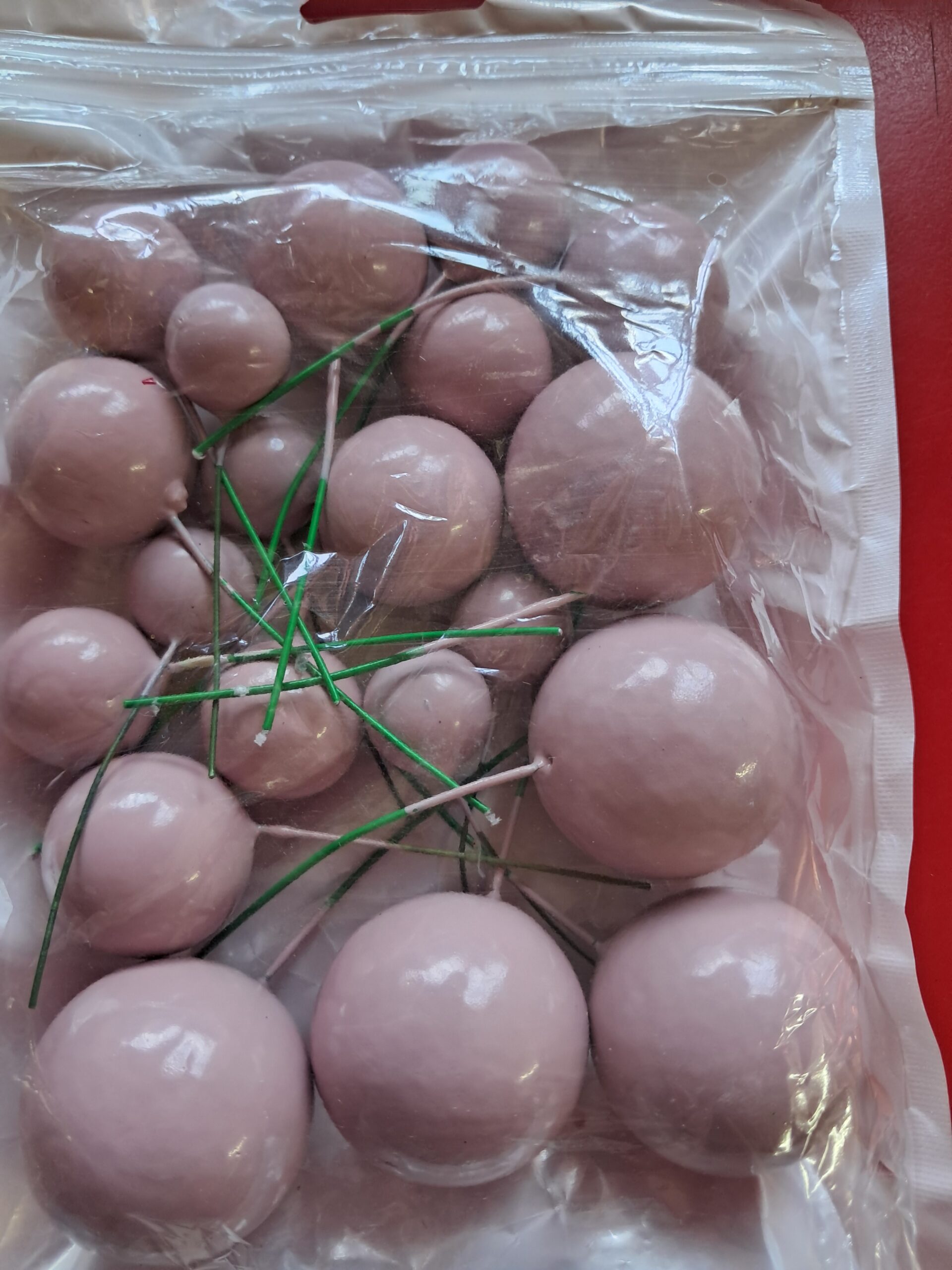 Pinkish purple colour faux cake balls 20’s. 20 Assorted sized faux balls per pack. Beautiful soft pinkish purple colour. Simply stick into a cake or baked goods. Faux balls are not edible.