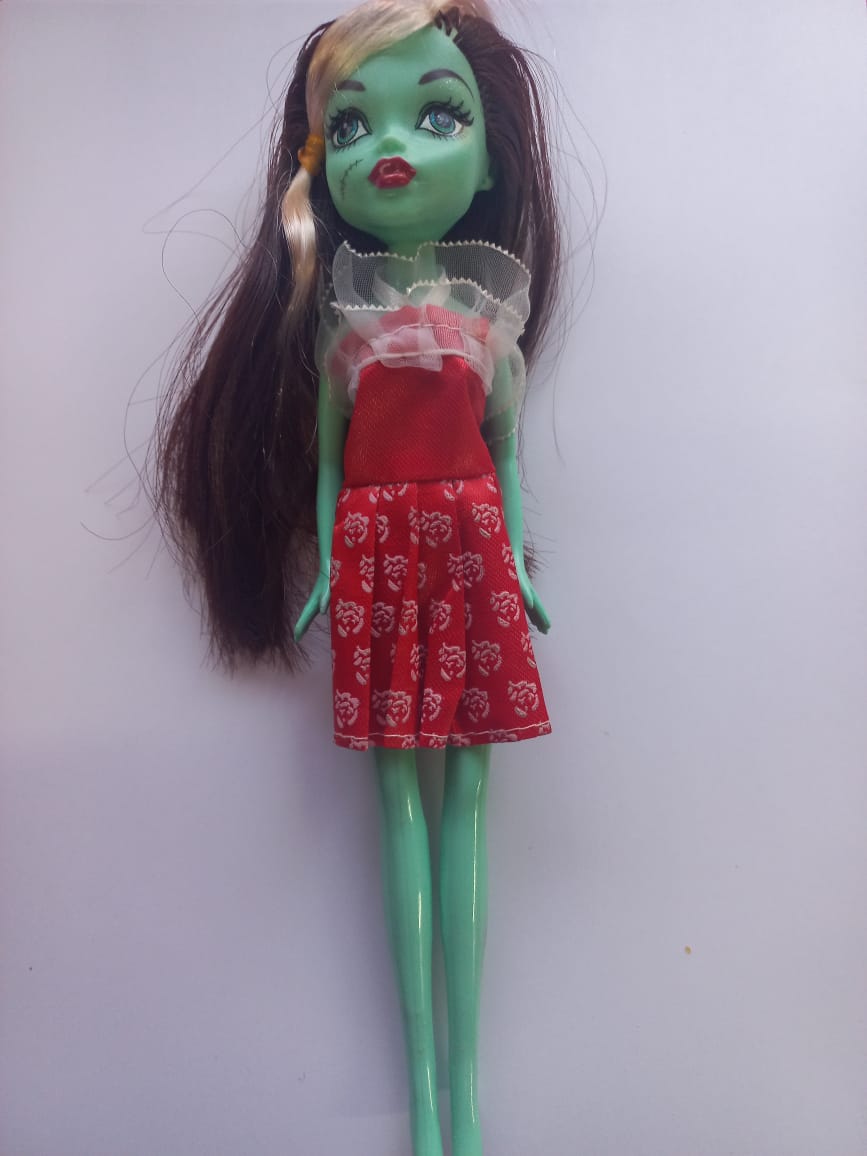 Plastic doll toy. Plastic doll, approximately 24cm long. Use as cake topper or table décor with a Halloween, Monster high or a skull party.