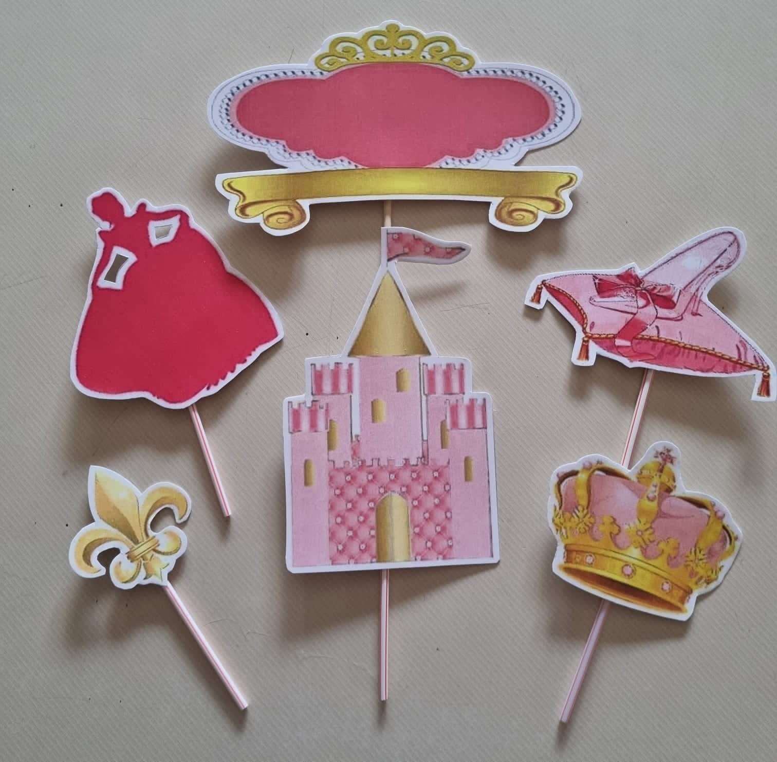 Princess theme cake topper set cardstock. Simply stick into a cake or baked goods. Cardstock topper is not edible and purely for decorative purposes. Great with a generic princess or princess fairy-tale party.