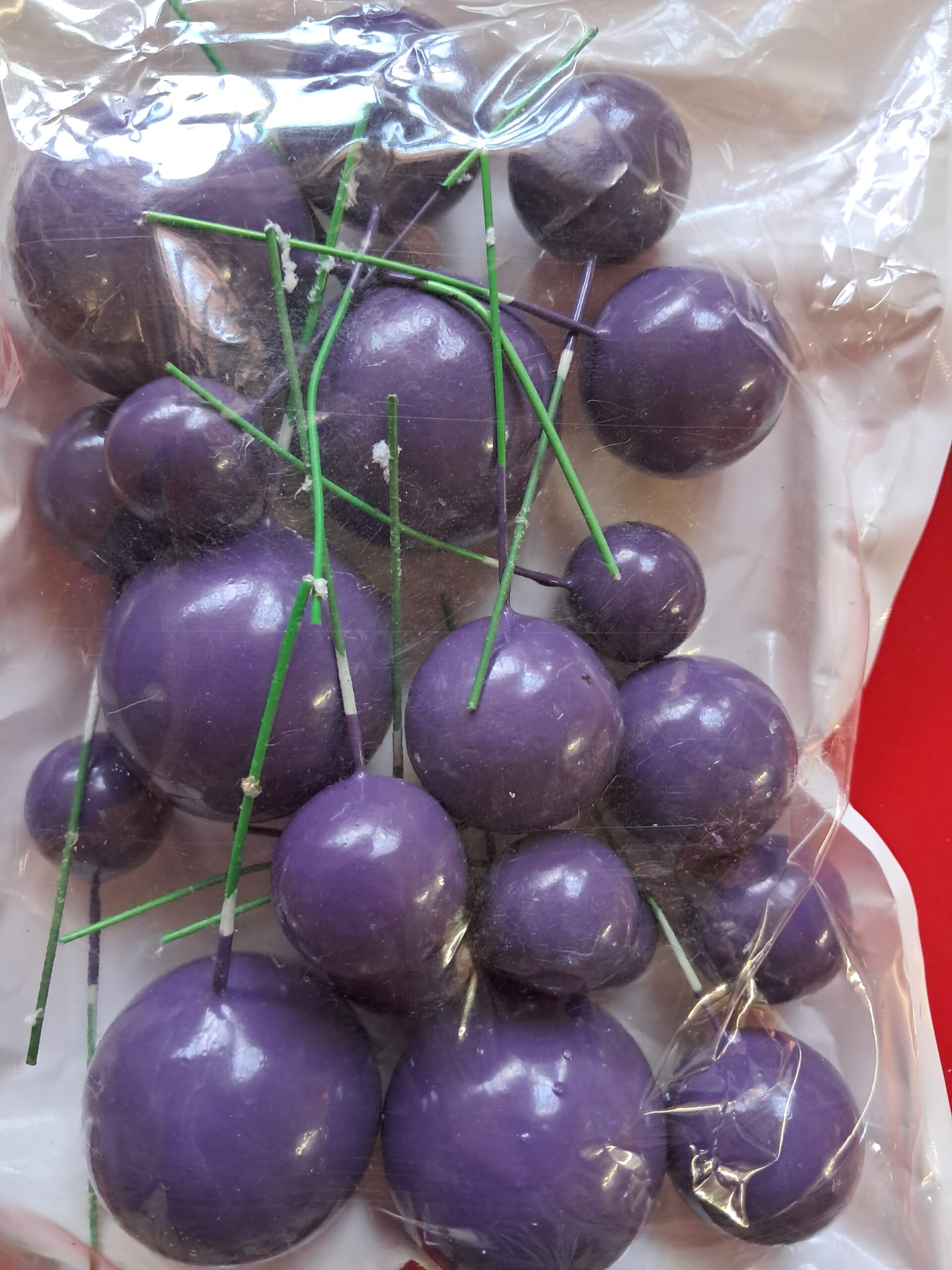 Purple faux balls 20’s. Darker purple faux balls. 20 Assorted sized balls per pack. Perfect to stick into a cake or baked goods. Faux balls are not edible.