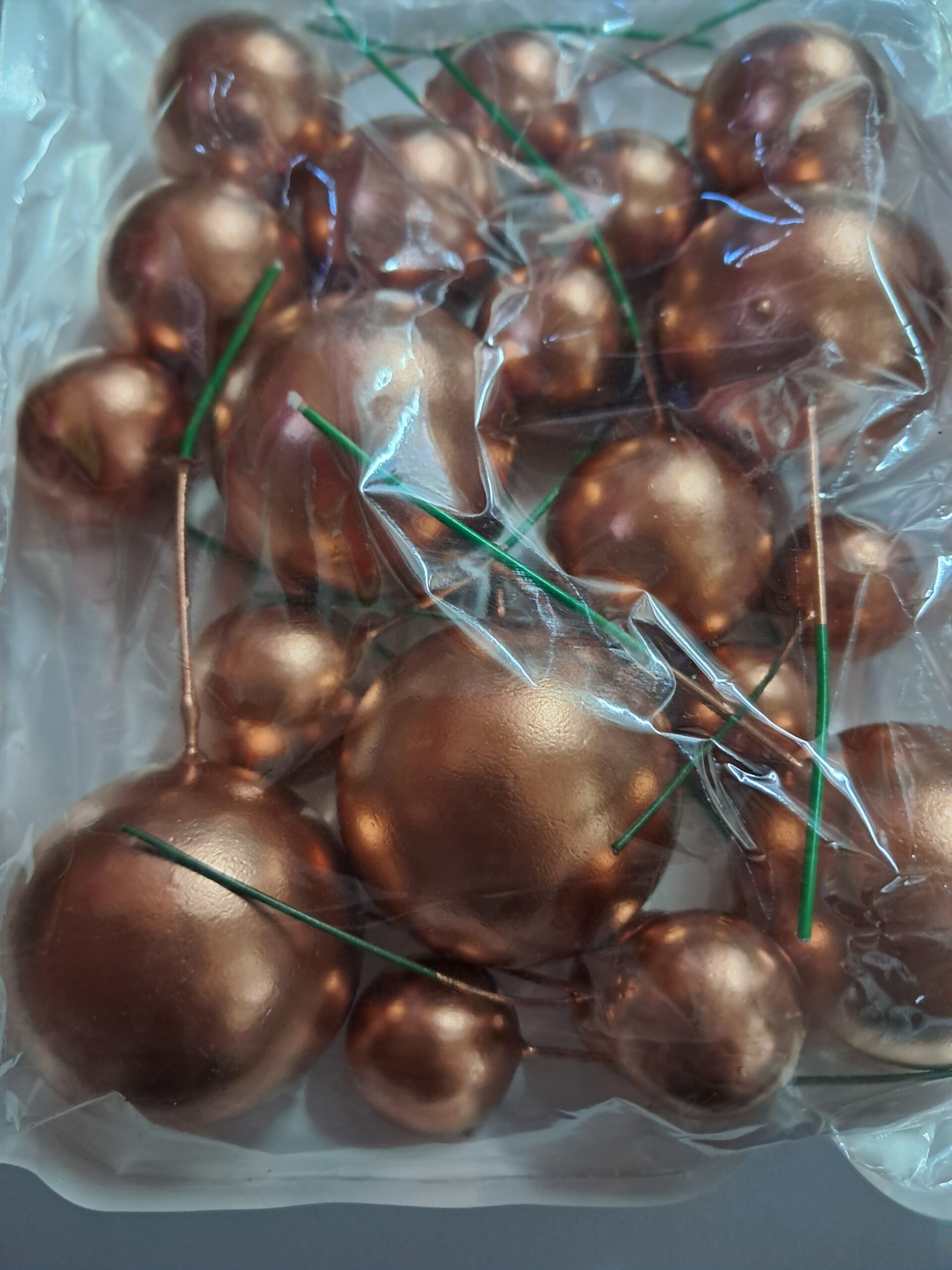 Rose gold faux balls 20’s. 20 Assorted sizes faux balls per pack. Shiny rose gold colour. Great to stick into a cake or bouquet.