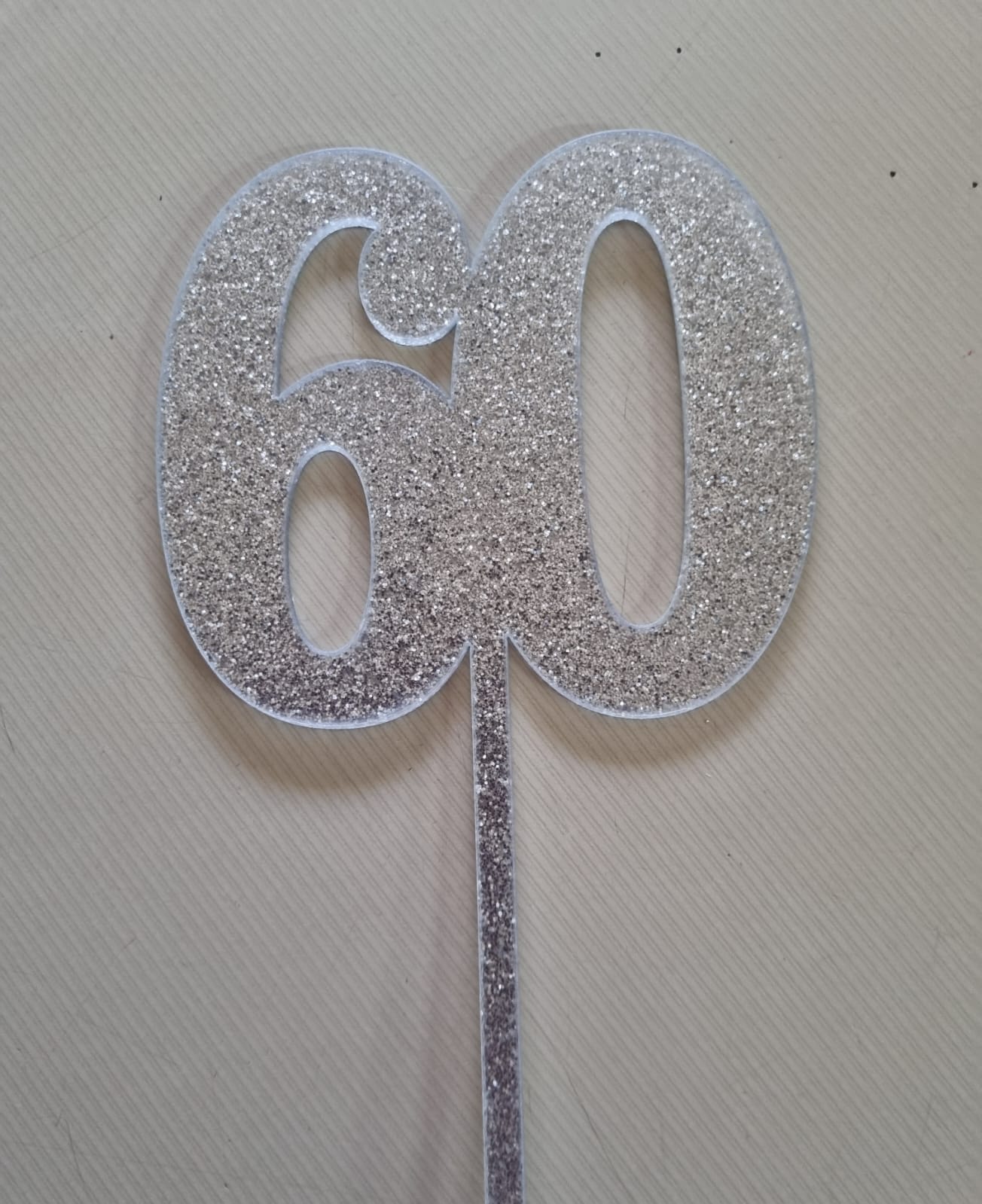 Silver number 60 cake topper acrylic. Simply stick into a cake or flower bouquet. Great with a 60th birthday.
