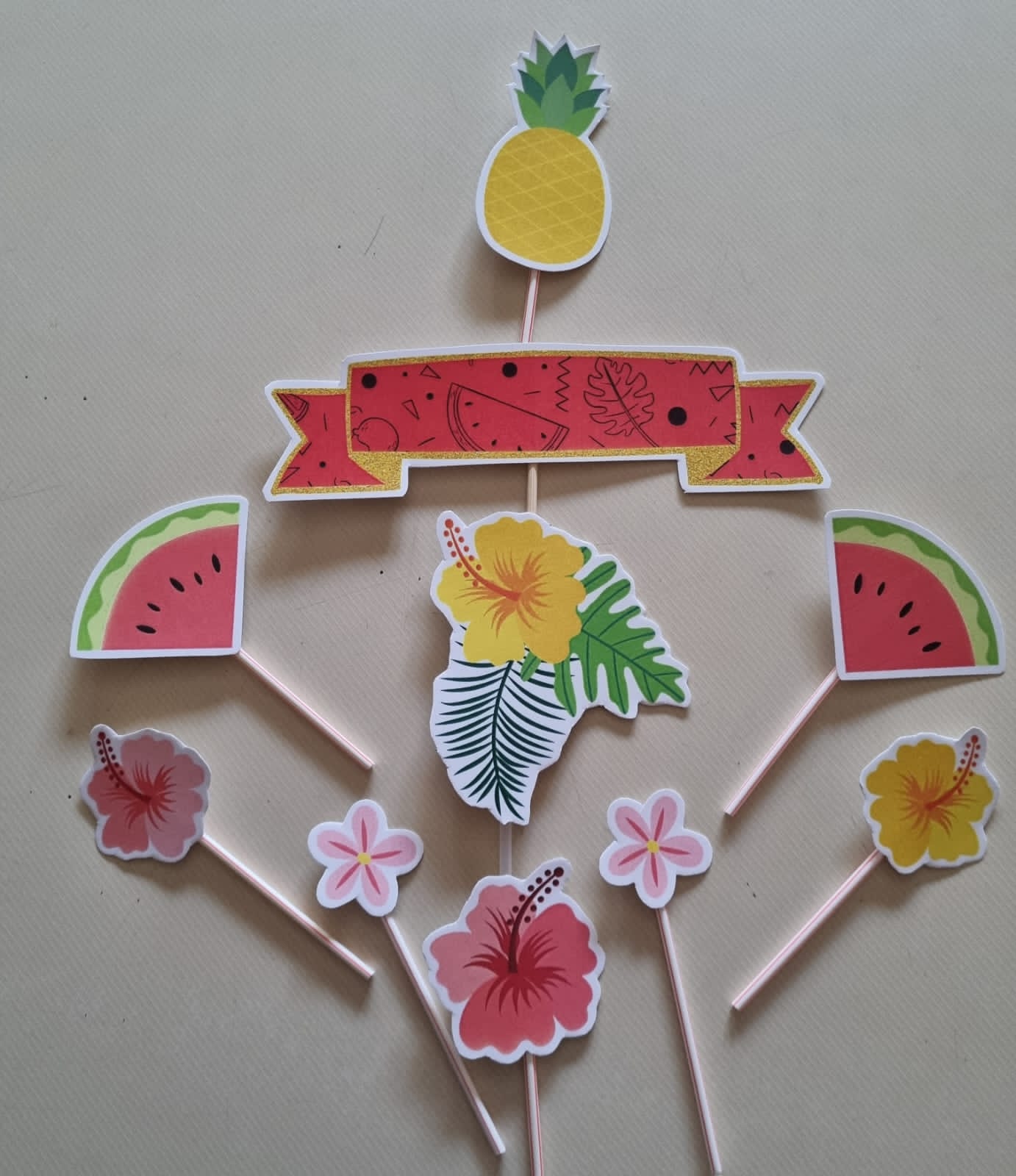 Tropical theme cake topper set cardstock. Tropical theme cardstock cake topper set. Perfect with a pineapple, watermelon, tropical, Hawaiian or island party.