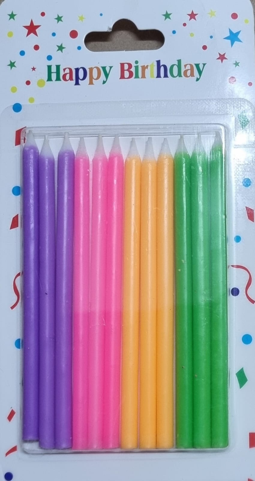 Neon candles 12’s girly colours. 12 Candles per pack. Neon colours, but does not glow under a uv light. Great addition to a Neon, disco or 80’s theme party.