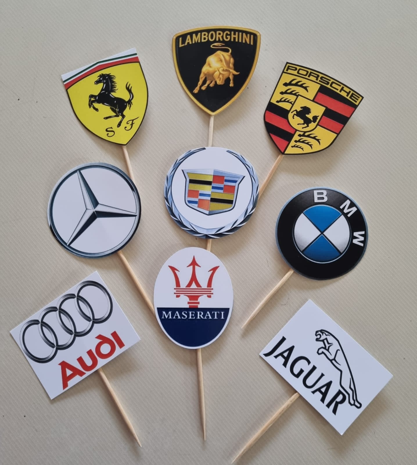 Super car’s food picks. 9 Picks per pack. Use as cake toppers or on cup cakes. Assorted car logo’s. Great with a formula 1, racing or glam car party. Picks are not edible.