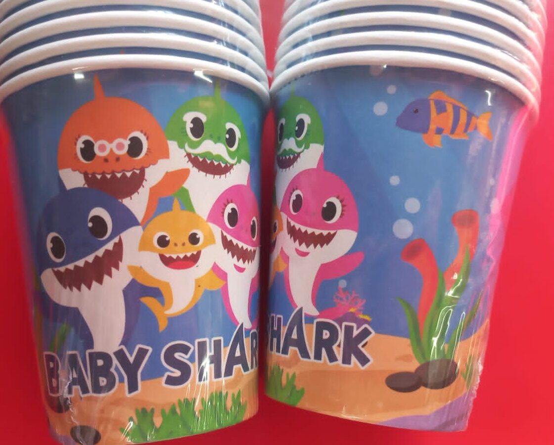 Baby shark paper cups. 10 Cups per pack. Simply add juice or other drinks.