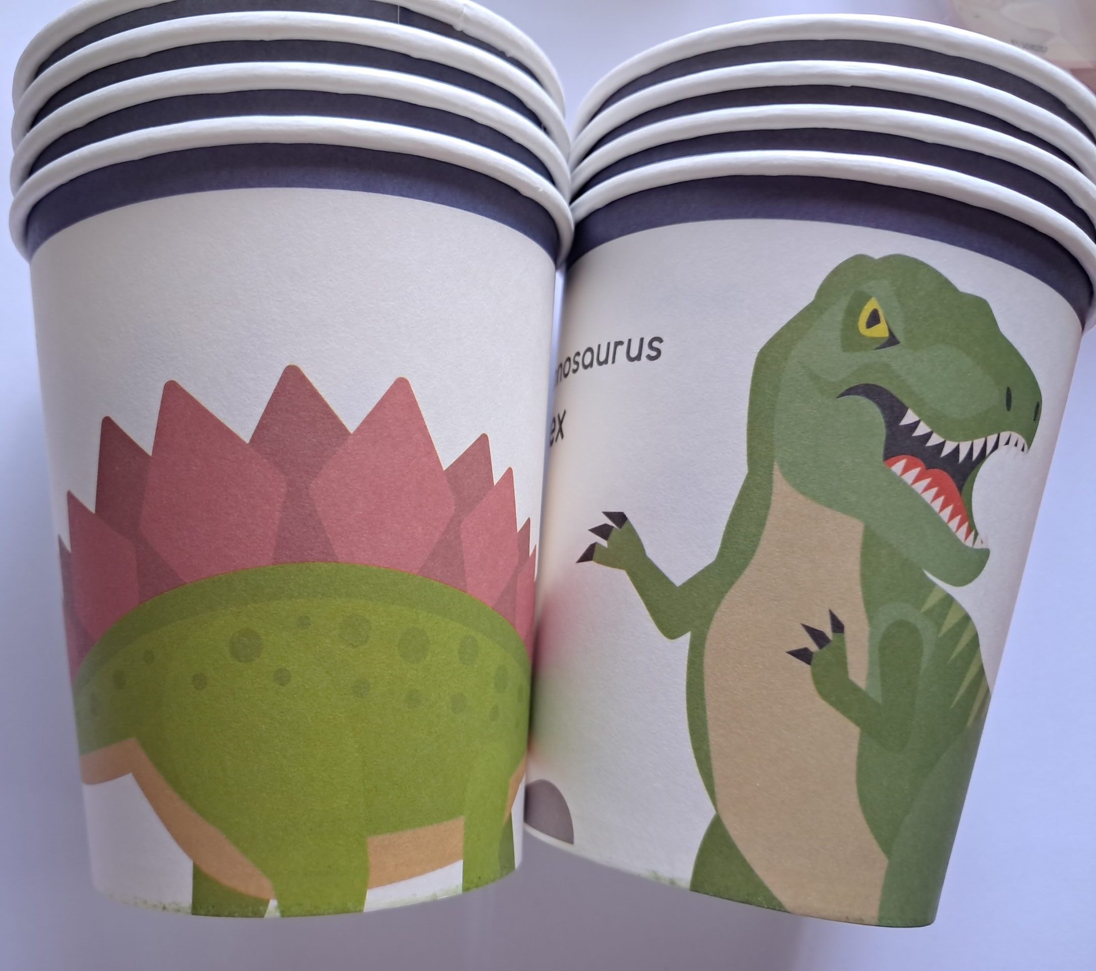 Dinosaur theme paper cups 8’s. Great for juices or drinks. 4 T-rex and 4 Stegosaurus cups.