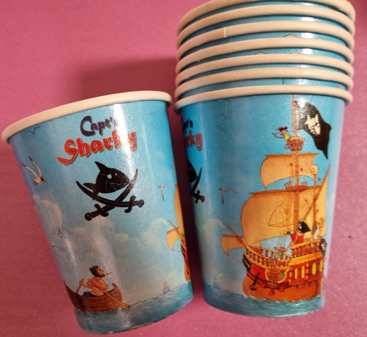 Pirate theme paper cups. 8 Cups per pack. Perfect with a pirate, nautical, or under the sea party. Add juices, drinks, popcorn or fruits.