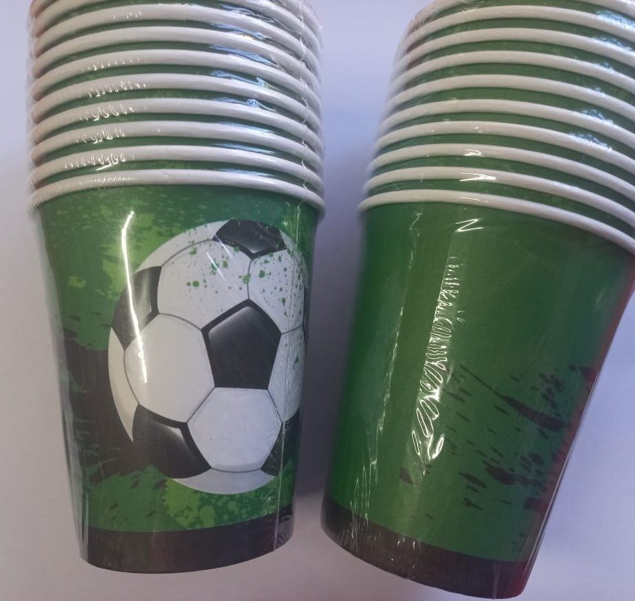 Soccer paper cups 10’s. Soccer theme cups, perfect for juices, drinks or popcorn. Great with a soccer party.