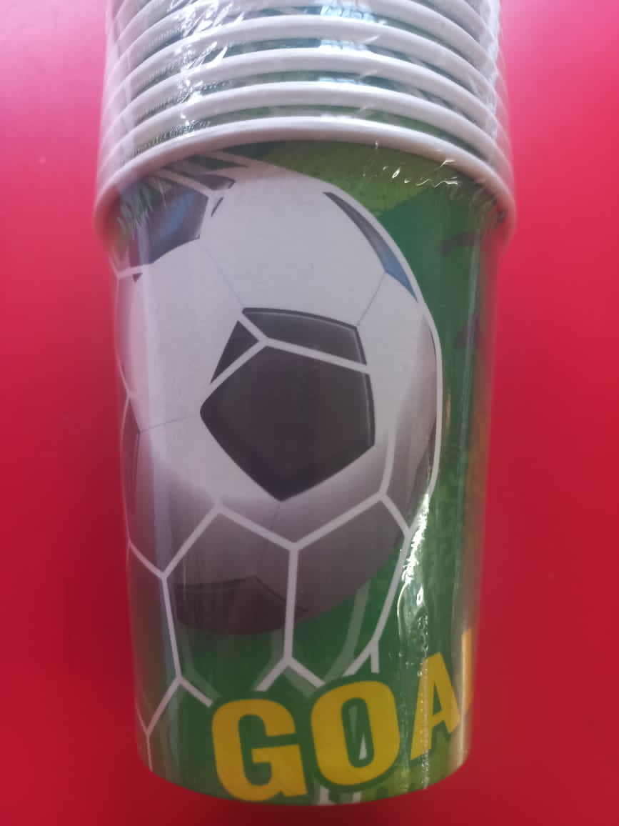 Soccer paper cups. 10 Per pack. Green with the soccer ball and wording GOAL. Great addition to a soccer party.
