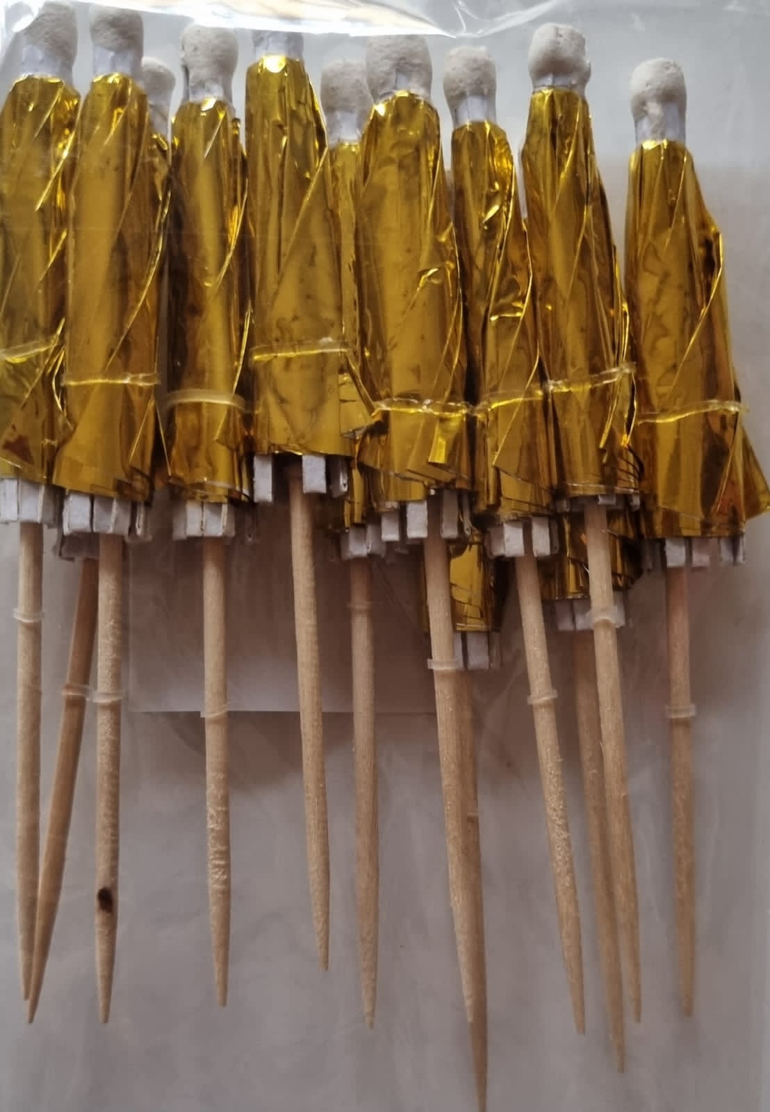 Gold cocktail umbrellas. 12 Per pack. Perfect for cocktails or fancy dress parties. Add to drinks or snacks.