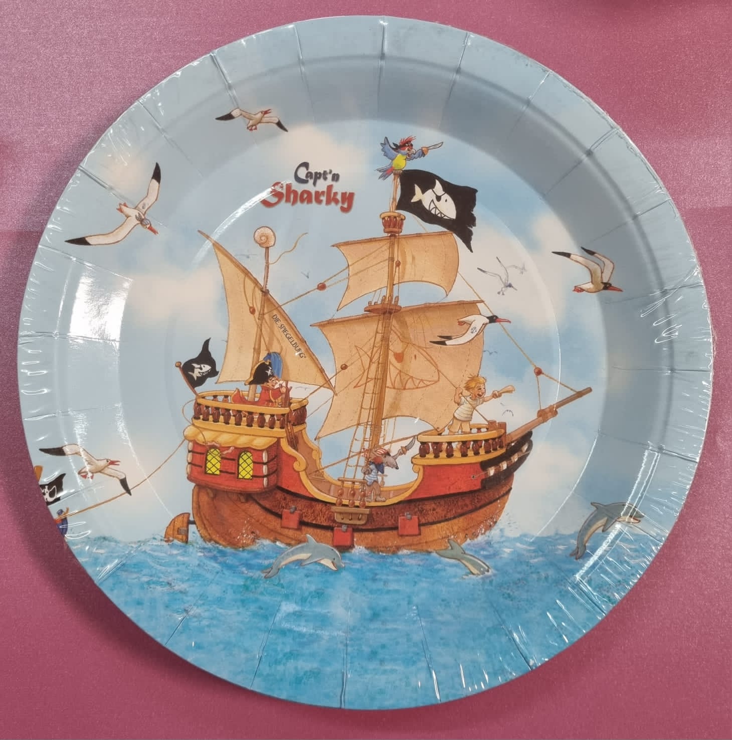 Pirate sharky paper plates big. 8 Plates per pack. Perfect for cake, snacks or food.