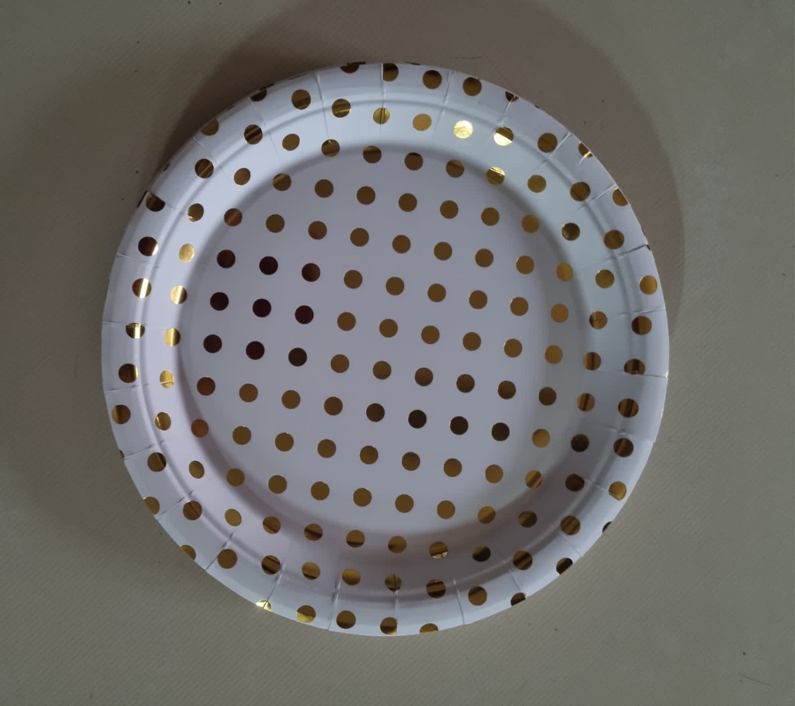 White and gold polka dot plates big, 9 inch. 10 Paper plates per pack. Great for cake or snack serving. Perfect to add a touch of elegance to your cake or snack table.