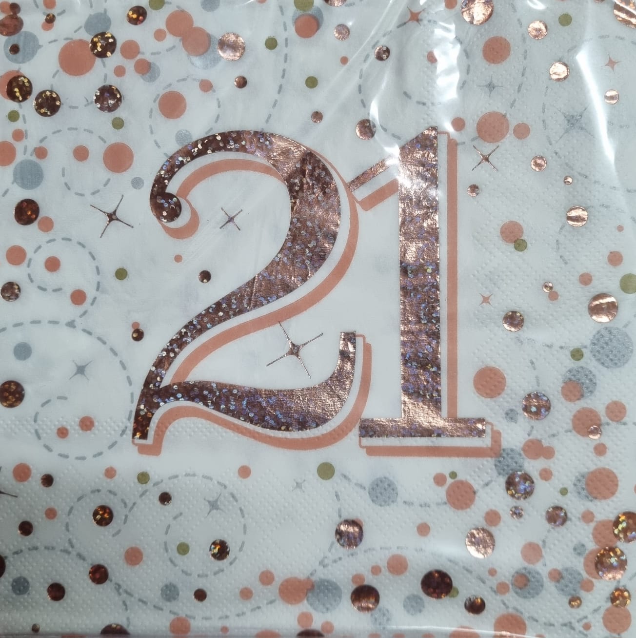 21 St Birthday serviettes 16’s. 16 Serviettes per pack. Great with a 21st birthday. Beautiful shiny rose gold colour.