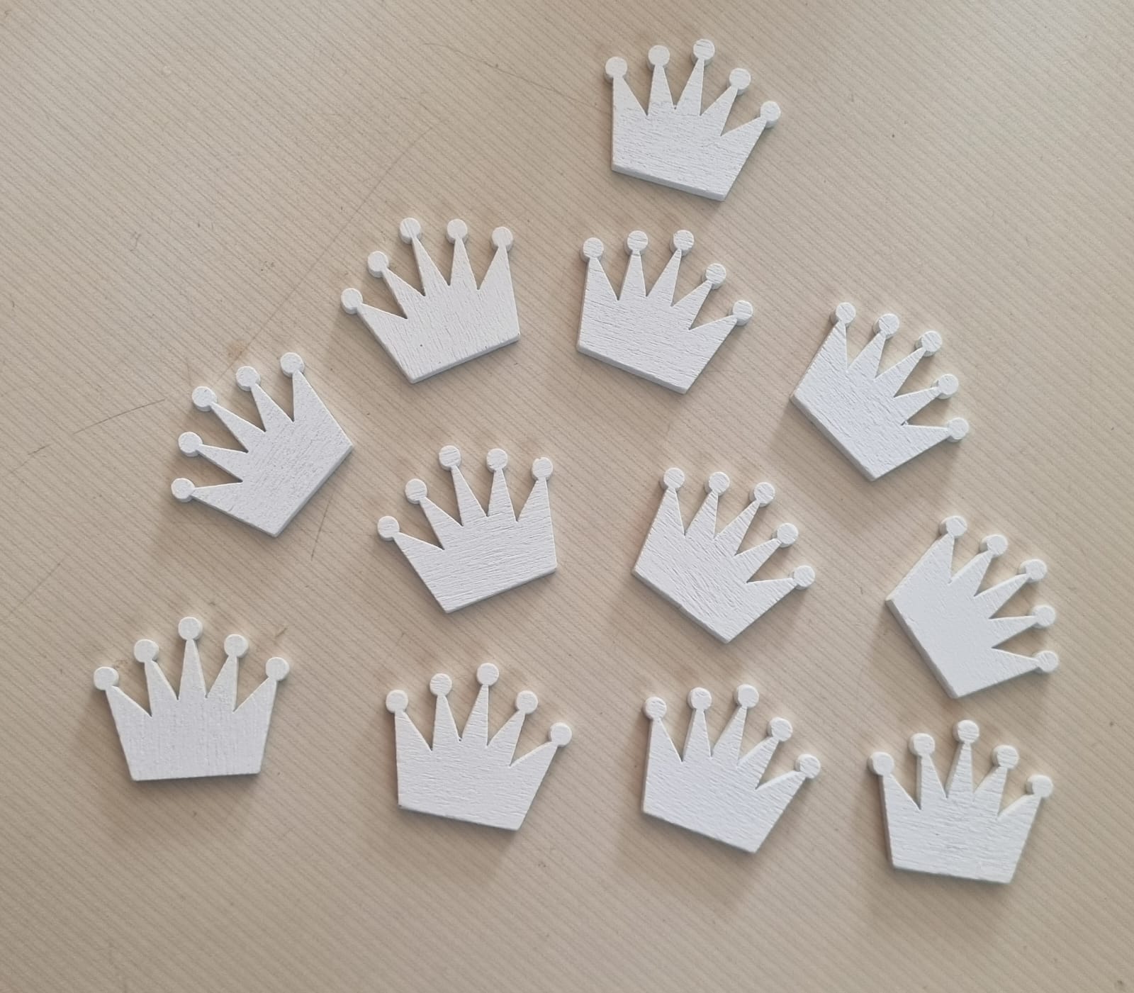 12 Mini wooden crowns flat. Great to stick onto party boxes/ bags or scatter as table confetti. Perfect with a princess or fairy tale theme party. 12 Wooden flat crowns in a pack. Measures 2cm from left to right on the bottom and 2.5cm from top to bottom.