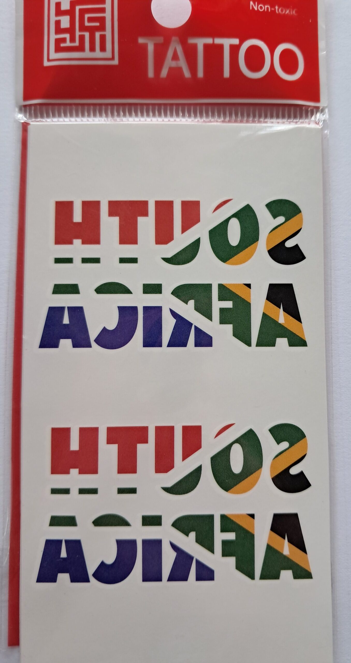 South African tattoos. 6 Sheets per packet, each sheet has 2 tattoos, so 12 tattoos in total. Great with a sporting day, Rugby, Cricket, Soccer, proudly SA or heritage day celebration.