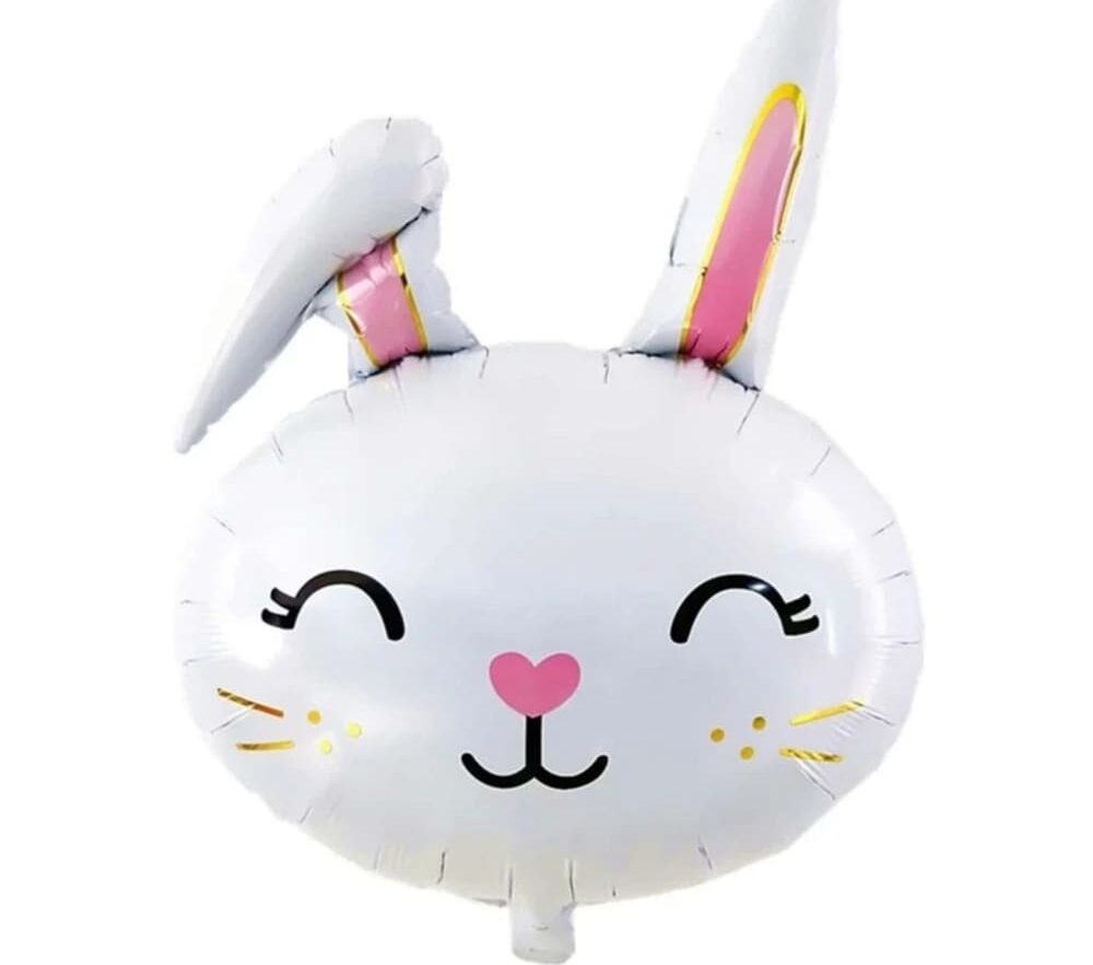 Bunny rabbit face shape foil balloon. From ear to chin 74 cm and face is approximately 53 cm in diameter.  Fill with helium or normal air. Great with a rabbit, woodlands or easter party.
