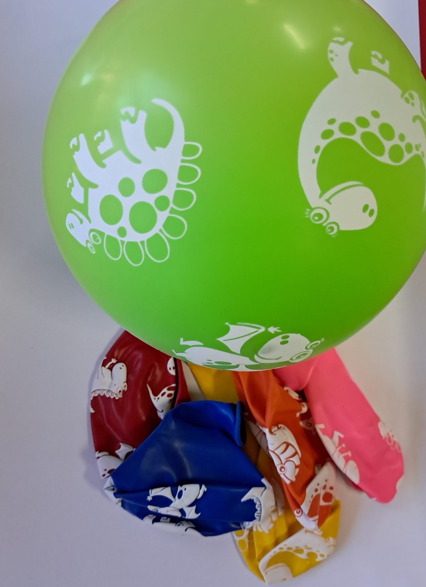 Dinosaur latex balloons 10’s assorted. 10 Latex balloons per pack. Assorted colours per pack, including pink. Great for a dinosaur lovers party. Fill with helium or normal air.