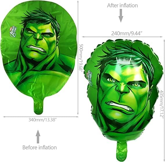 Hulk foil balloon, face shape. 1 Per pack. Measures 50 x 34 cm uninflated. Great with a Hulk, super hero or avengers party. Fill with helium or normal air.