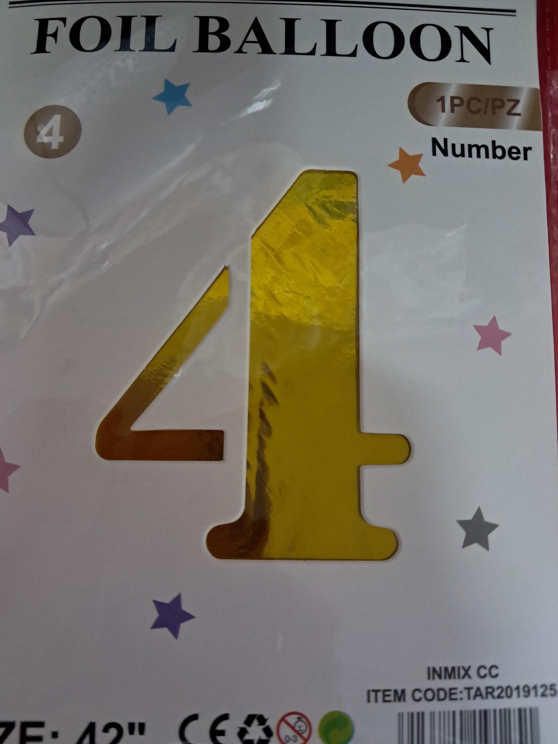 Number 4 foil balloon gold. 42 inch. Fill with helium.