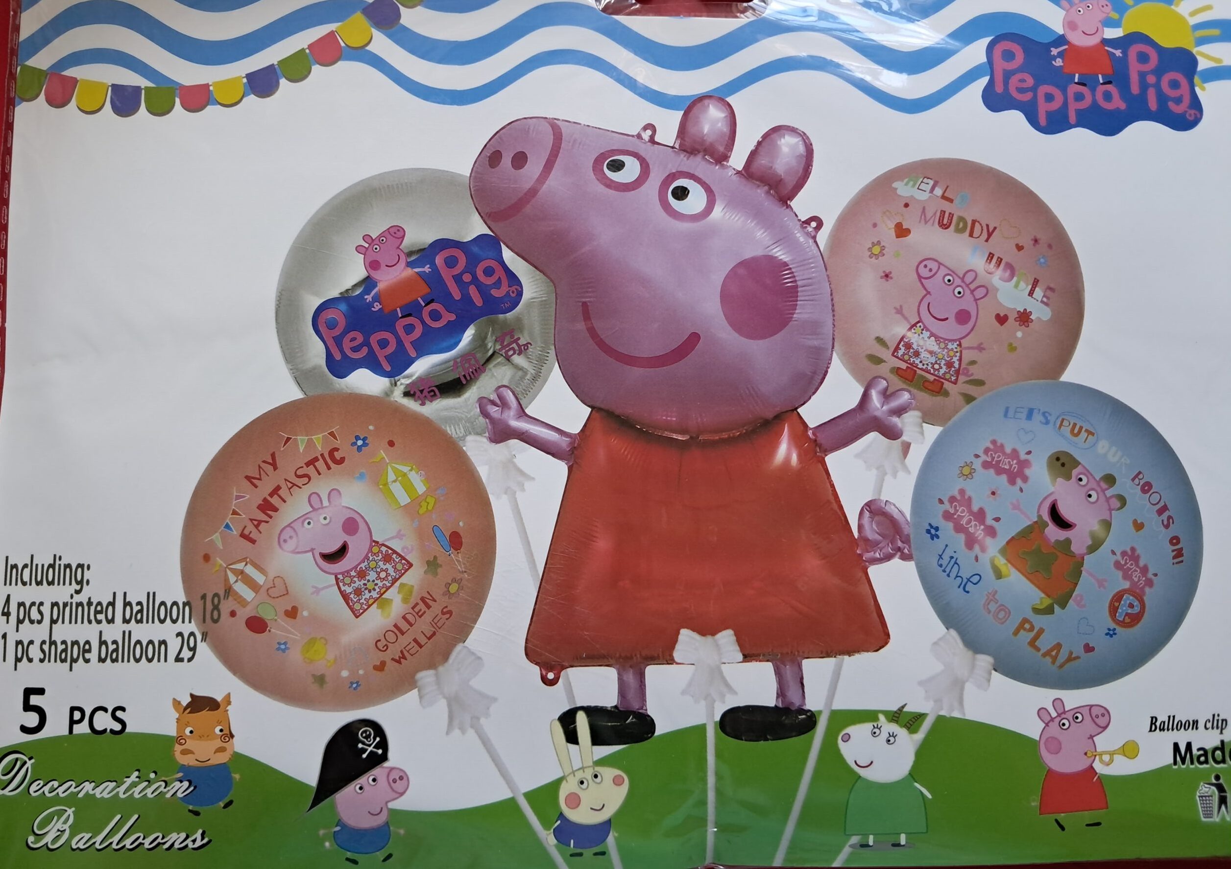 Peppa pig 5pcs foil set balloon. This set consist of 1 x Peppa shaped foil balloon, 29 inch and 4 x 18 inch round foil balloons. Fill with helium or normal air. Great décor item.