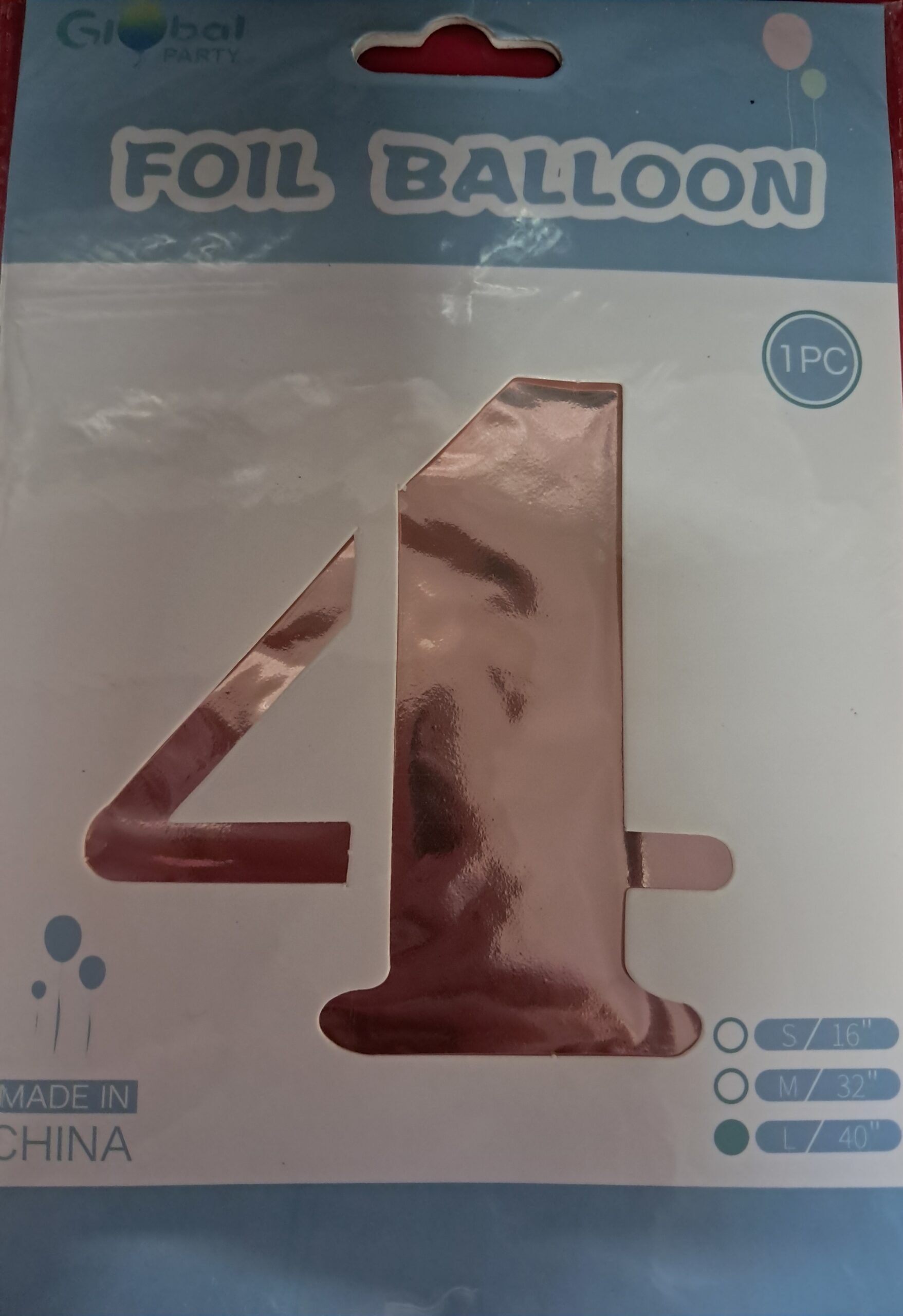 Rose gold number 4 foil balloon big. 40 Inch foil balloon. Fill with helium or normal air. Great décor item for a 4th or 40th birthday celebration.