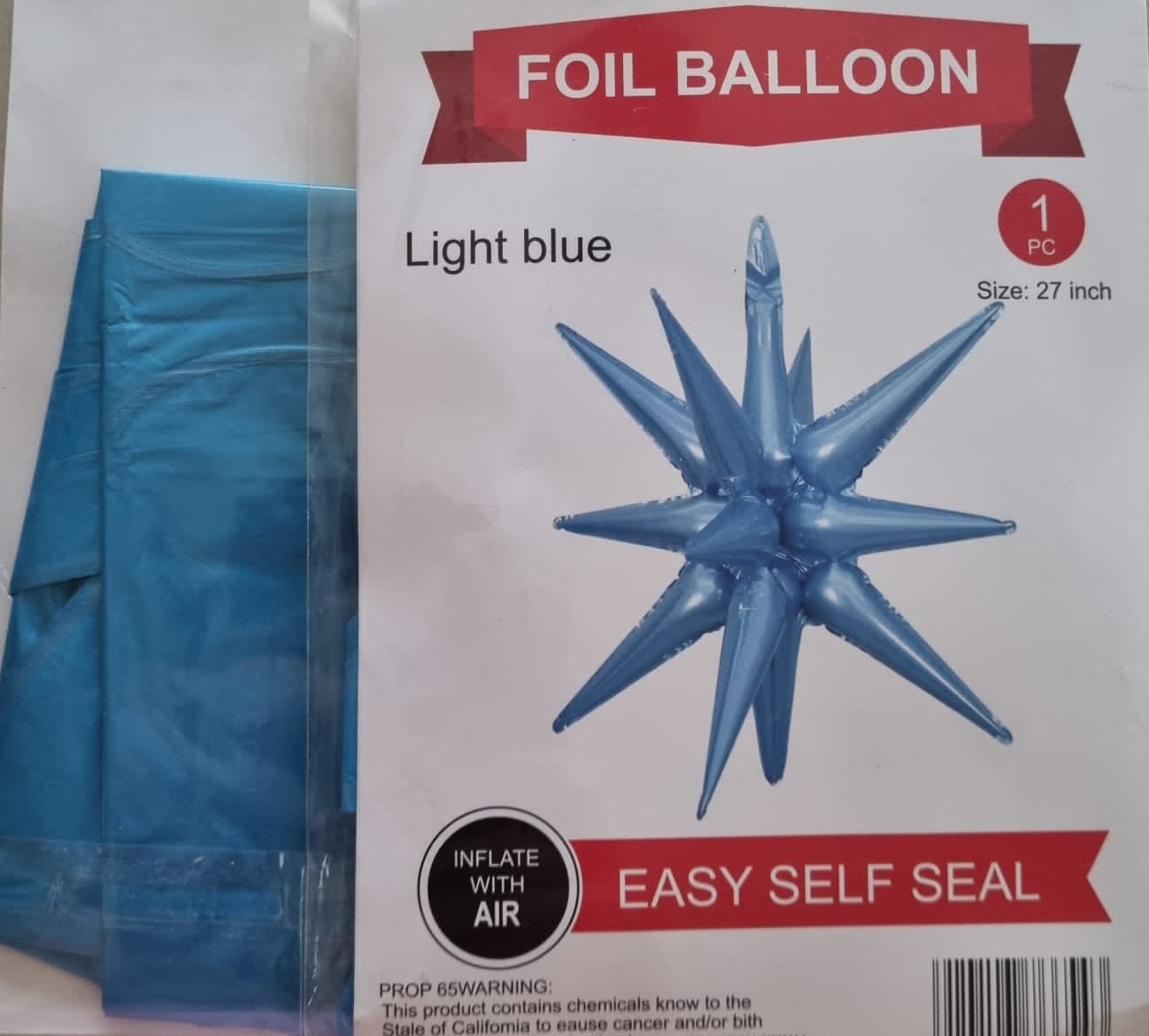 Skye blue pointy star foil balloon. Measures 27 Inch. Fill with normal air. Great as décor with most themes. Add a fun touch to your balloon set up.