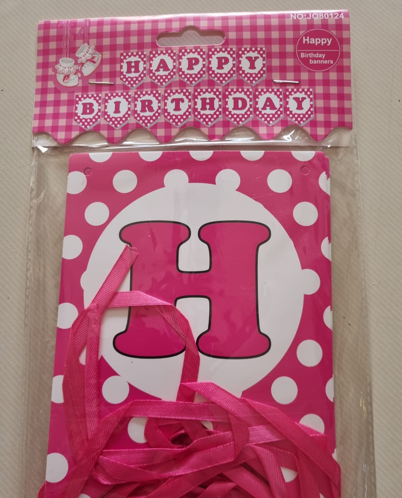 Cerise pink and white polka happy birthday banner. Display on a wall or gate. Great décor item for a birthday. Cardboard happy birthday banner.