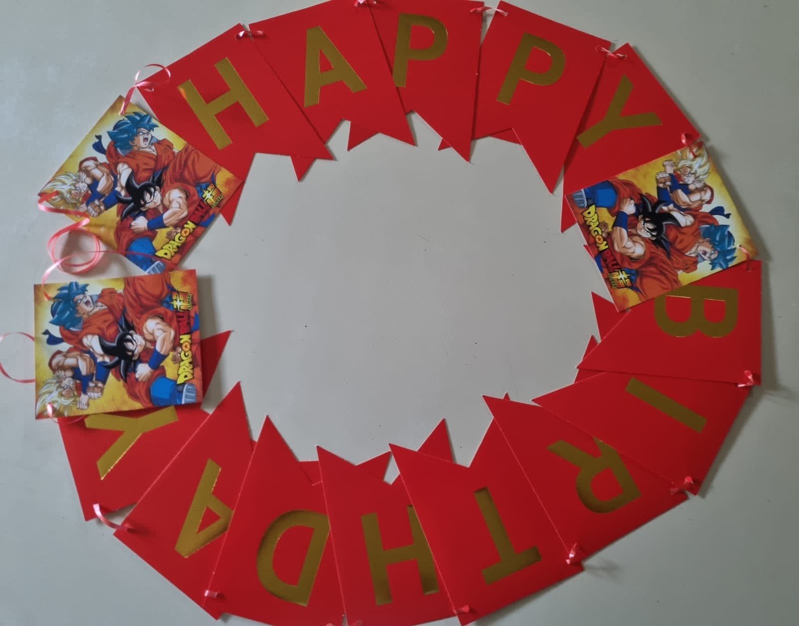 Dragon ball Z happy birthday banner. Cardboard banner, already strung. Fold open and display on a wall or gate. Great decor item for your Dragon ball z theme party.