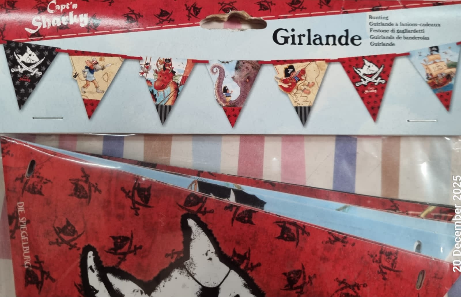 Pirate sharky cardboard flag banner . Approximately 3 meters long. Display on a wall or gate or between trees. Great décor item.