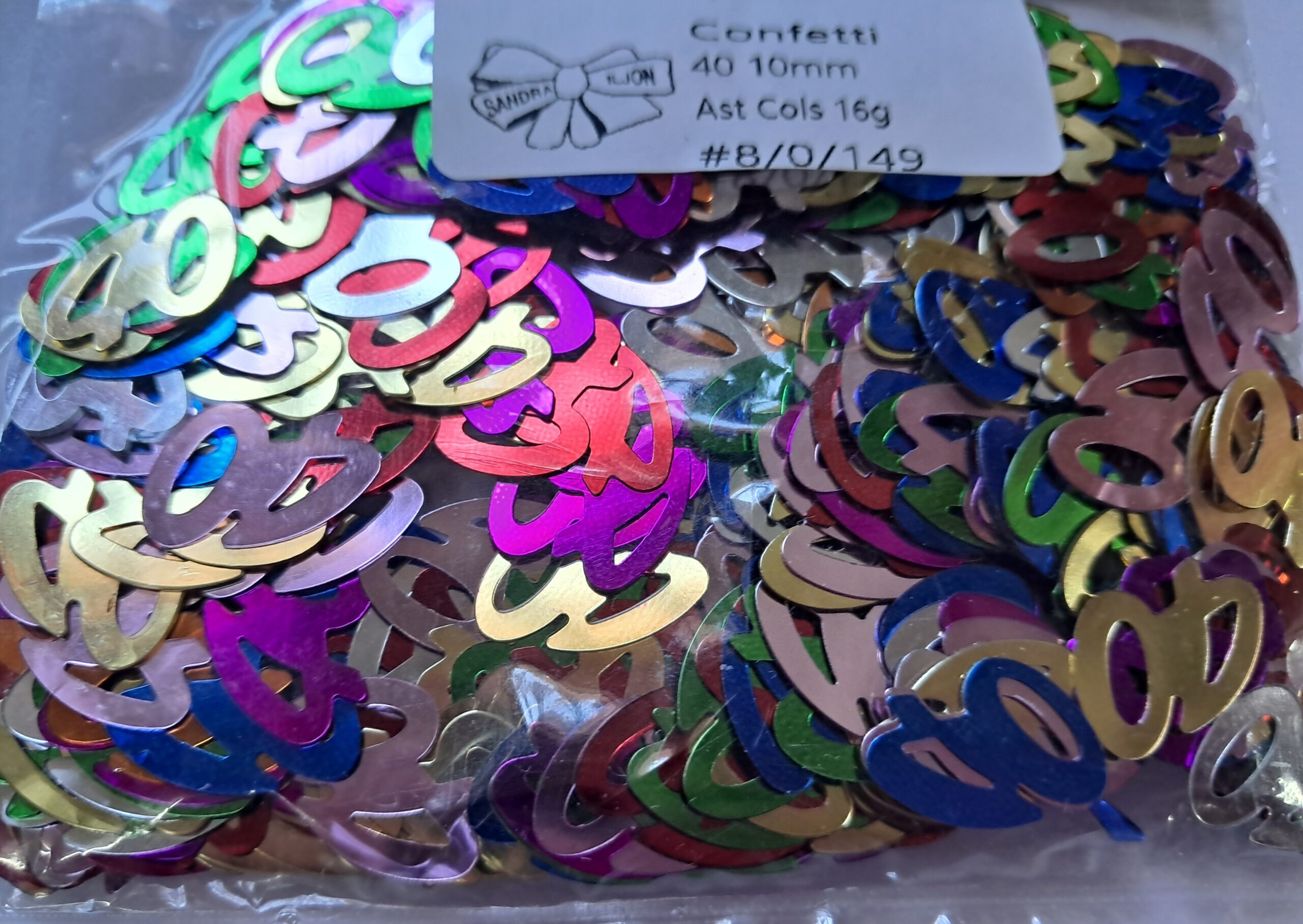 40th Confetti assorted colours. 10 mm in size, approximately 16 gram pack. Assorted multi coloured number 40’s. Scatter on your tables. Perfect for a 40th birthday.