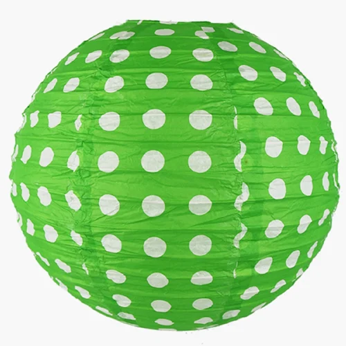 Green polka dot Chinese lantern 25cm. Sold flat. No lights included. Great to hang outside or display on a floor. Nice lime green colour with white polka dots.