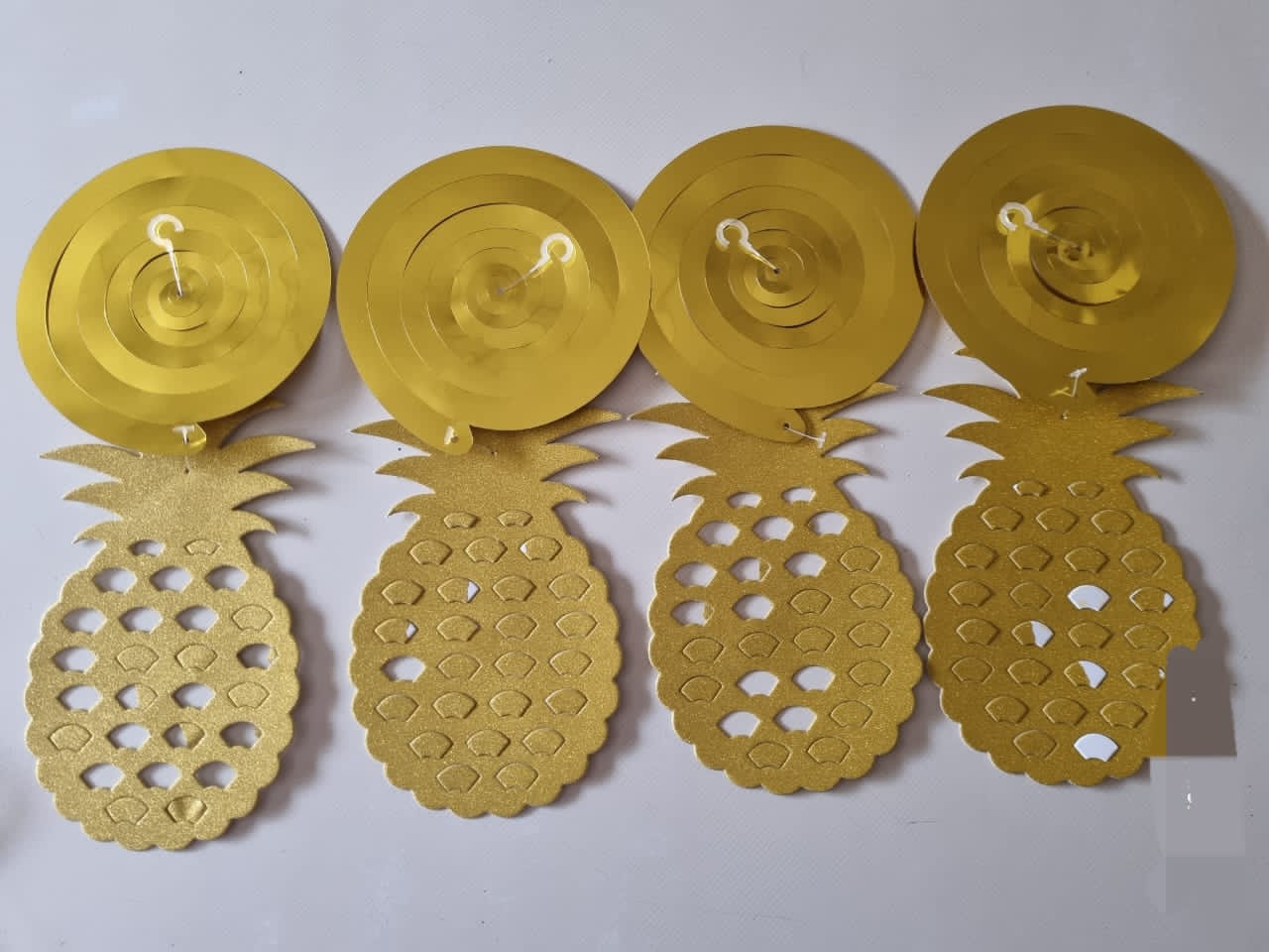 Pineapple hanging décor. 4 Strings per pack. Great item for a tropical, Hawaiian, island, sponge bob, Moana, tuti fruity or fruit theme party. Great to hang from the roof or trees.