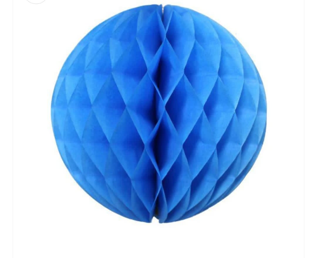 Skye blue paper ball 25cm. Sold flat. 1 Per pack. Measures 25cm in diameter. Great décor item. Display in front of a table or hang from the roof or trees.