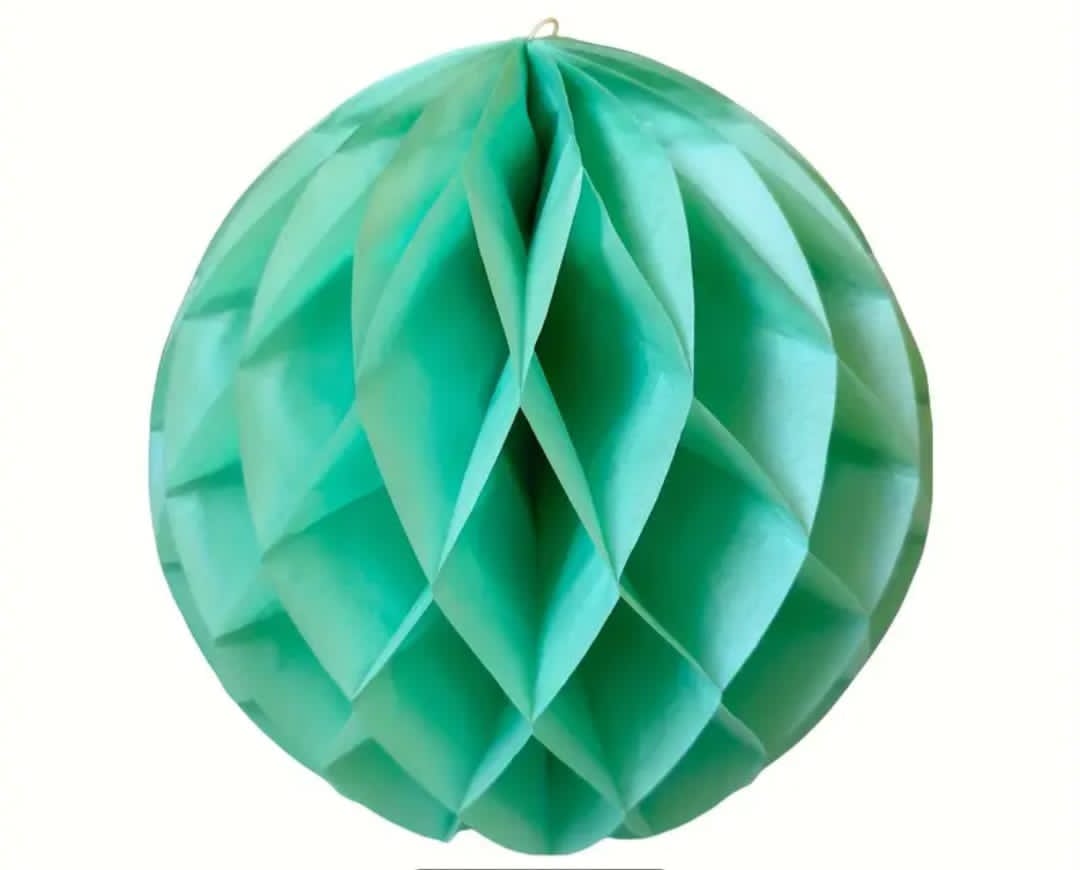 Teal light green paper ball 25cm. Measures 25 cm in diameter. Sold flat. 1 Per pack. Hang from the roof, trees or display in front of the table.