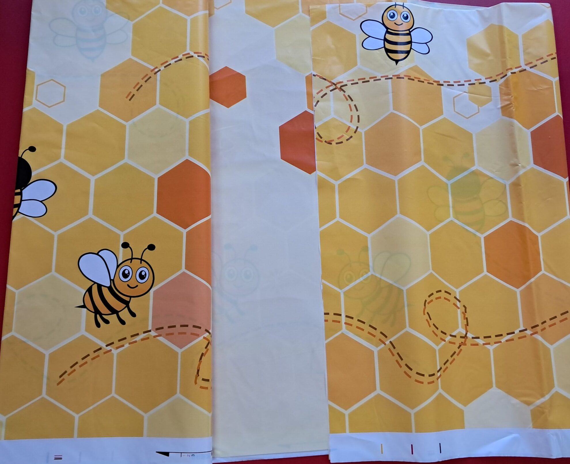 Bee theme plastic table cover 130 x 220 cm. Display on a table. Great with a honey bee, bee, bug or garden theme party. Measures 130 x 220 cm.