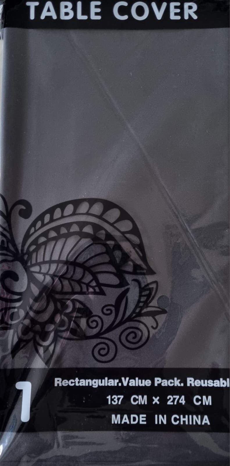 Black plastic table cover. 137 x 274 cm. Heavy duty disposable plastic table cover.