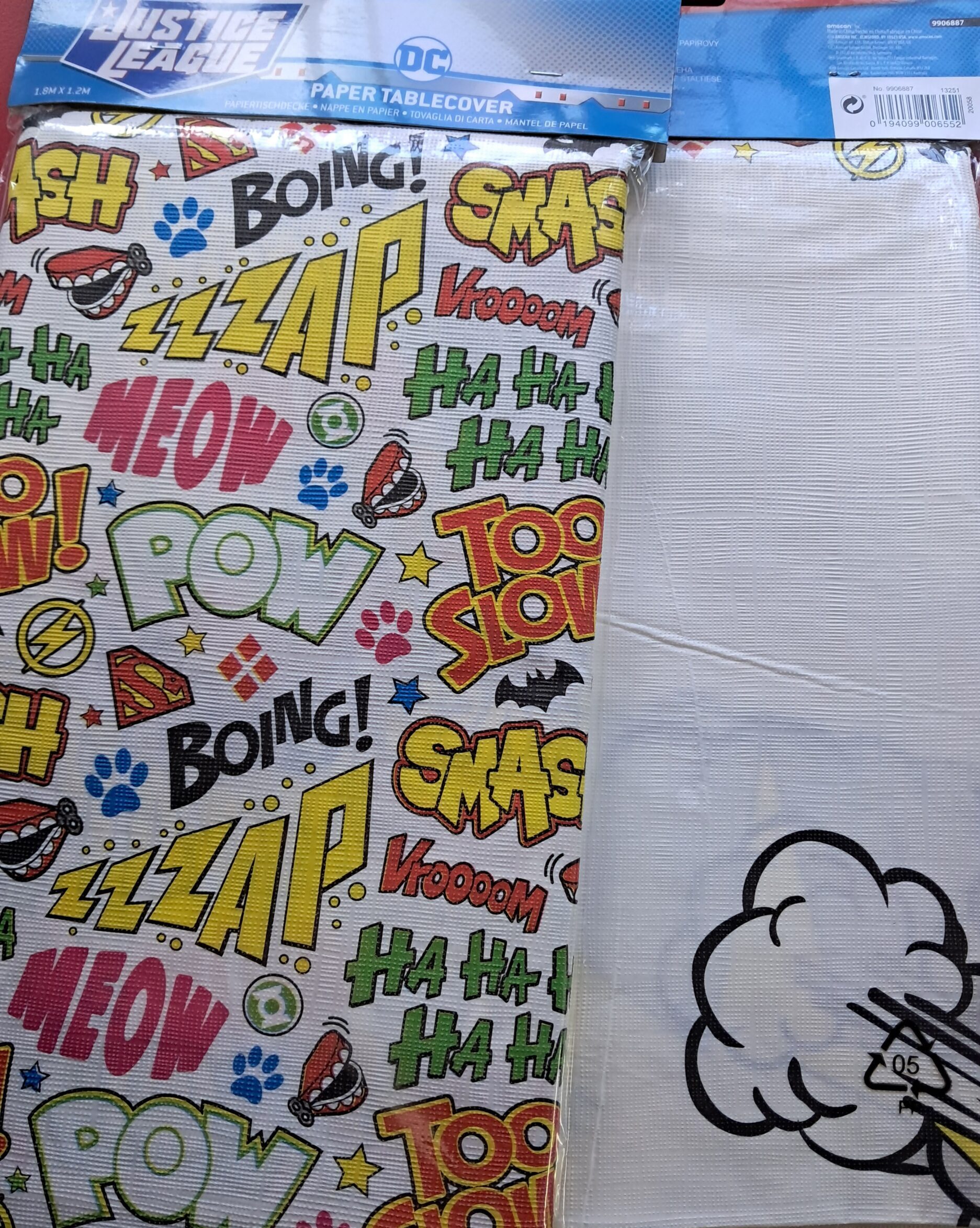 Justice league paper table cover. Paper table cover with fun Super hero words. Perfect with a superhero. Superman, Batman, Flash or Wonder woman party.  Measures 1.8 x 1.2 meter. White print in the middle with wording on the sides.