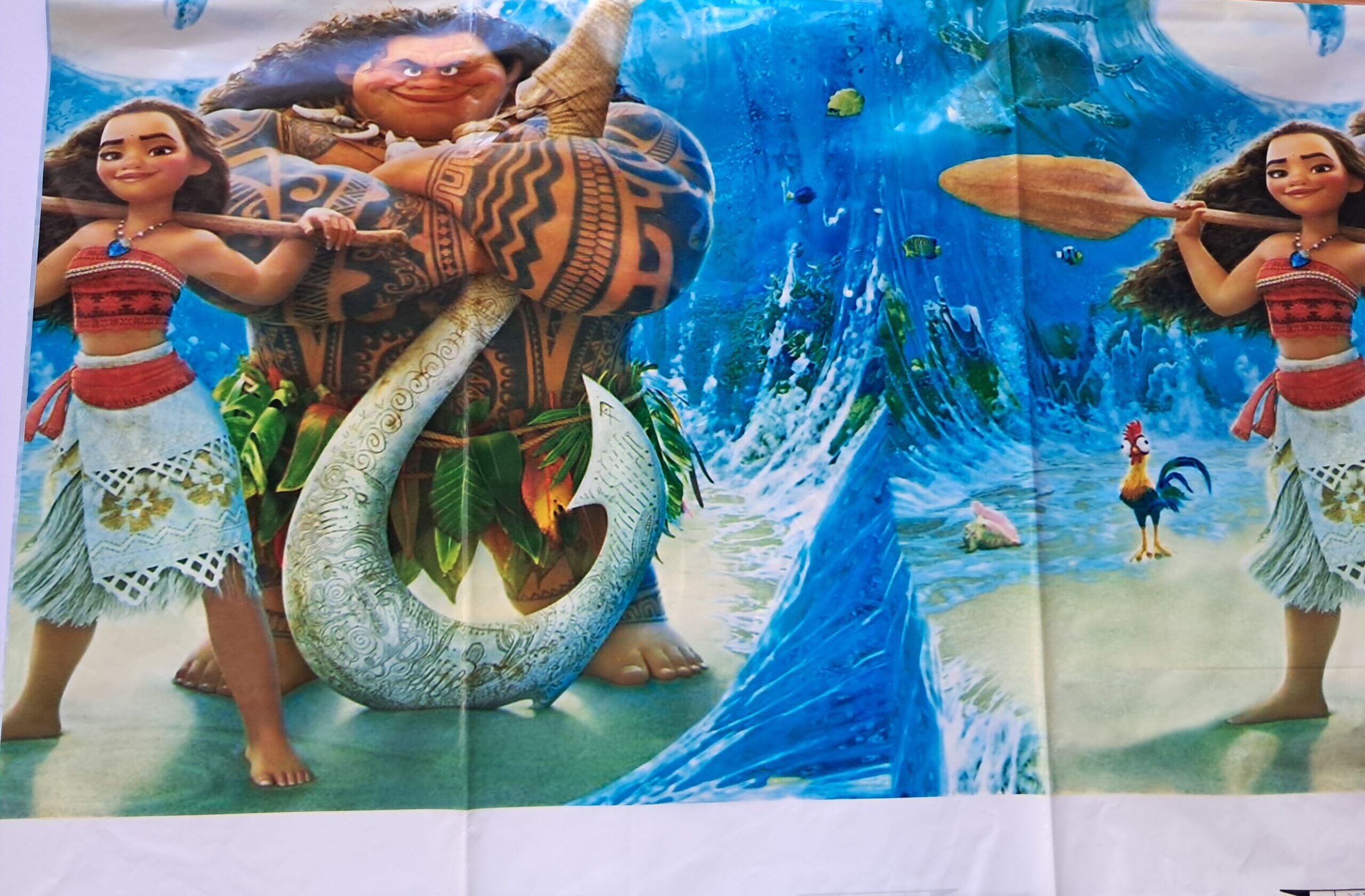 Moana plastic table cover. Approximately 108 x 180 cm. White strip in the middle with theme print on the sides. Great addition to a Moana party.