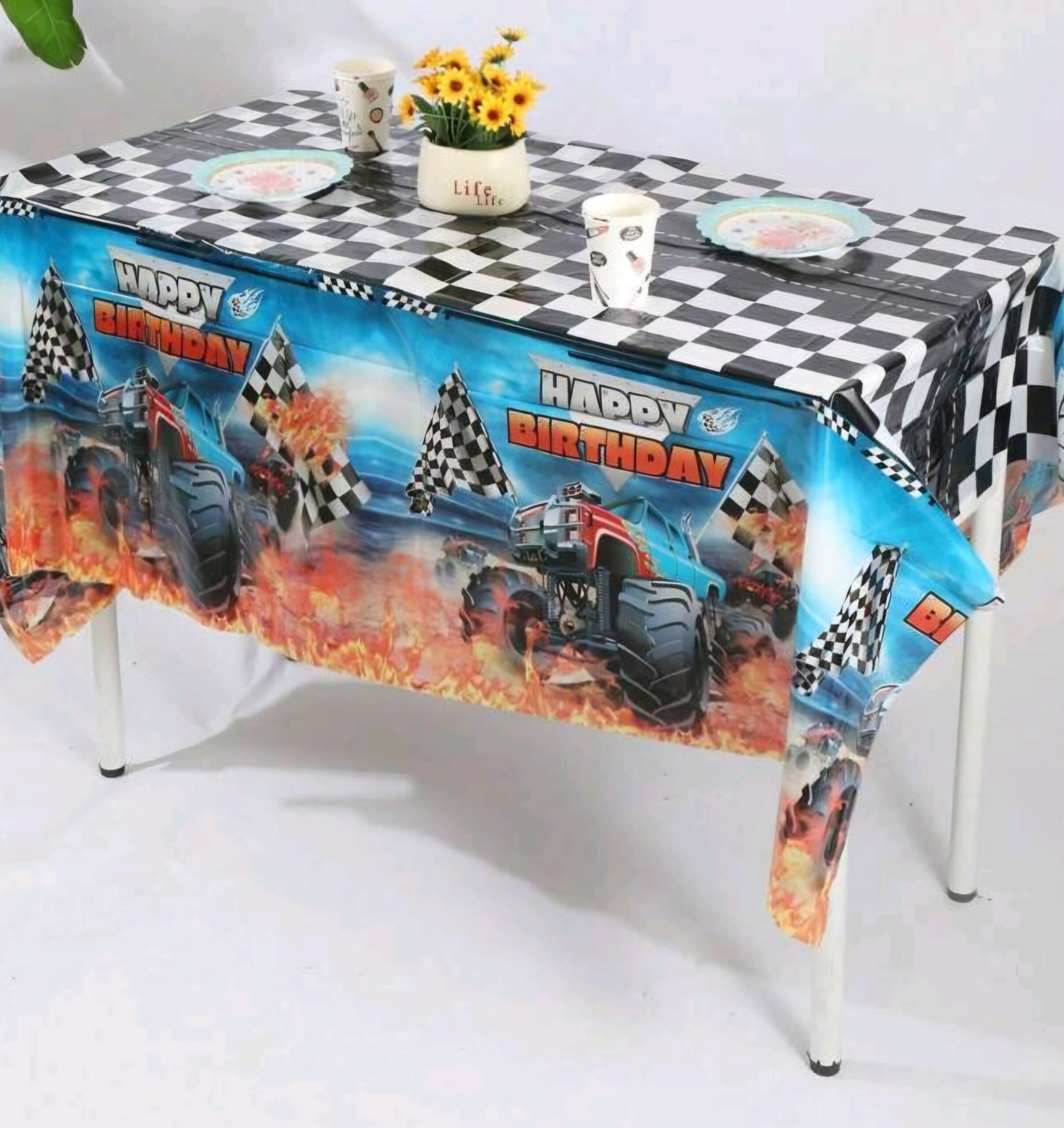 Monster truck plastic table cover. Measures 137 x 274 cm. Cover your party table in style. Great with a Monster truck or Blaze theme party. Disposable plastic table cover. 1 Per pack.