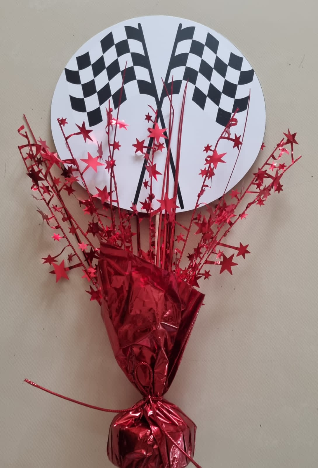 Racing theme centre piece red. 38 cm tall. Great addition to a racing, race car, formula 1, motorbike or car’s theme party. Display in the middle of a table.
