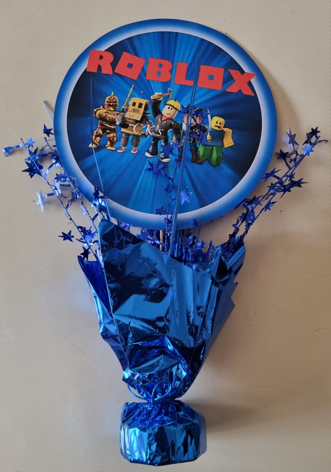 Roblox gaming centre piece. Approximately 38 cm tall. Display in the middle of your table. Can also add balloons around the bottom part.