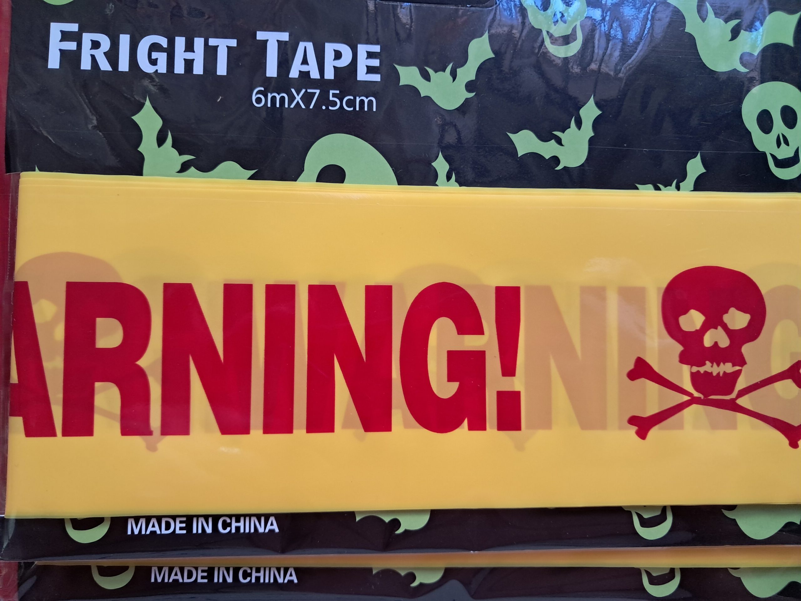Warning tape-yellow and red. Plastic yellow warning tape with red wording. Measures 6 m x 7.5 cm. Great with a Halloween, construction, police, science or racing theme party. Use as decoration, cordon off special areas or wrap around juice bottles.